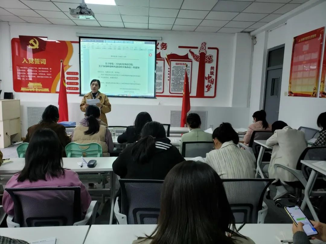 单菁华书记向同志们讲述了《关于加强师德师风建设的实施办法》、《关于成立师德师风建设委员会的决定》、《关于印发《青岛恒星科技学院师德失范行为处理实施细则》的通知》。