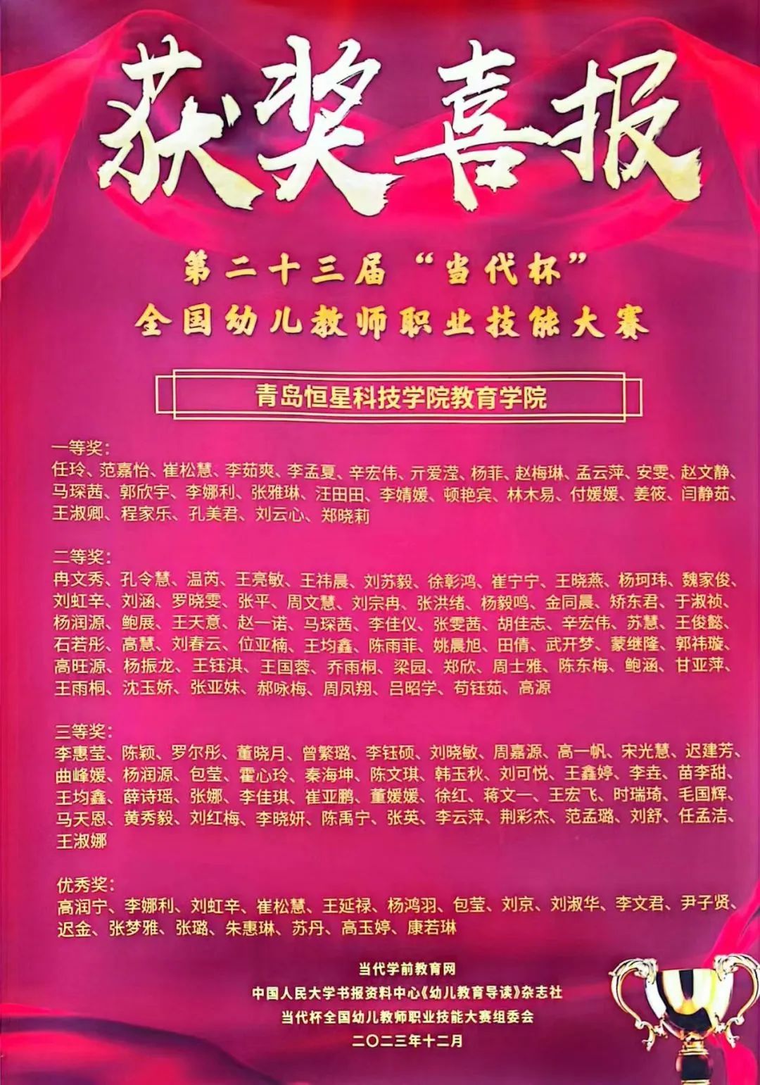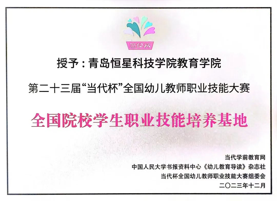 近日,第二十三届“当代杯”全国幼儿教师职业技能大赛落下帷幕。我院学前教育专业的多名师生在第二十三届“当代杯”全国幼儿教师职业技能大赛中勇夺佳绩,共有162个参赛作品获奖。其中一等奖29名,二等奖66名,三等奖45名,优秀指导教师11名,教育学院荣获“全国院校学生职业技能培养基地”称号。