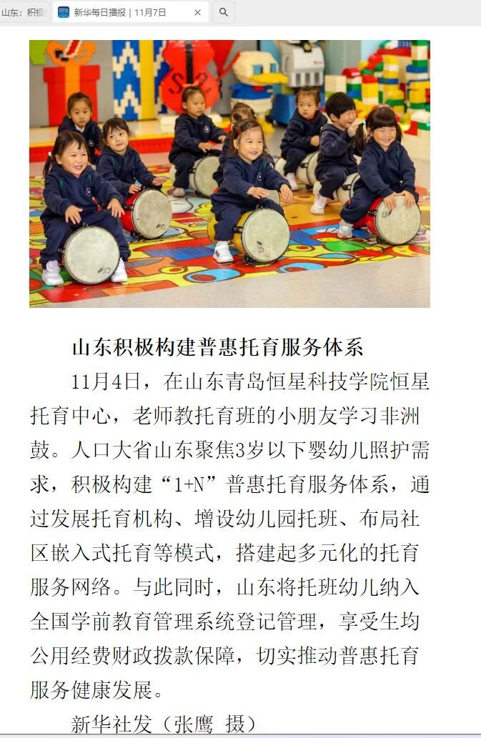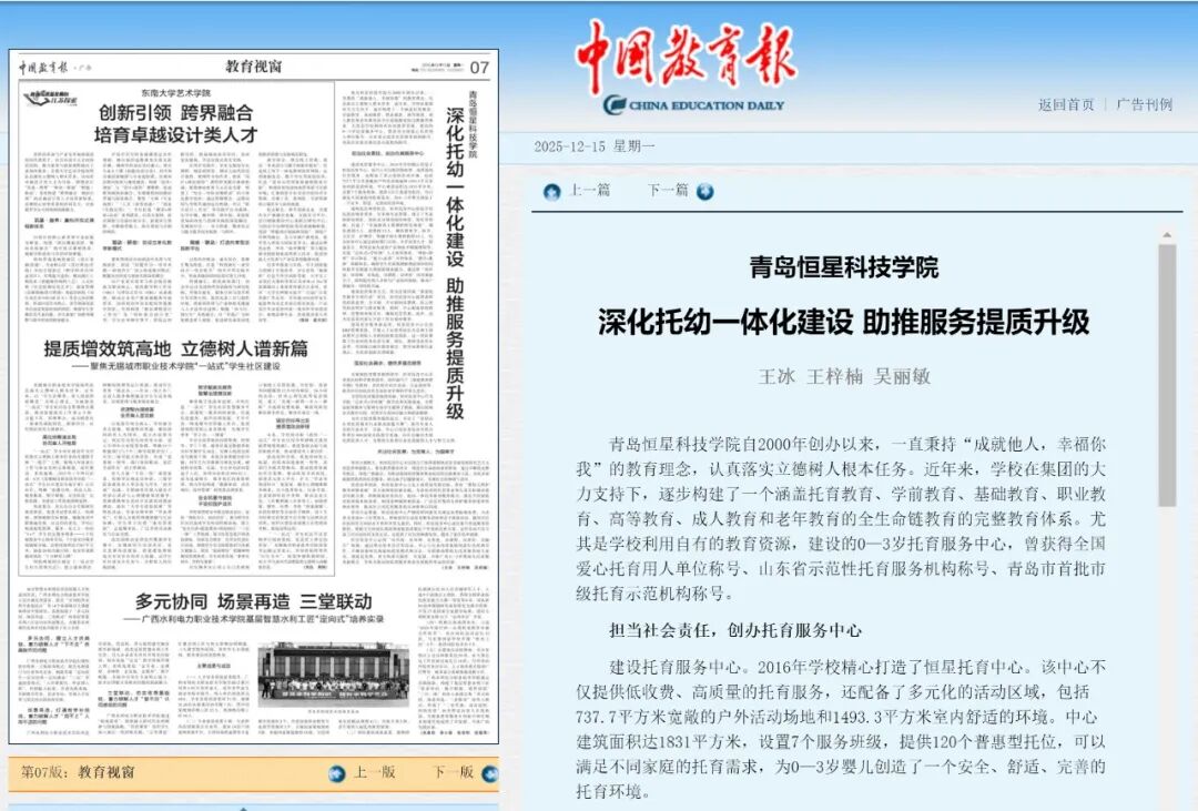 2025年12月15日,《中国教育报》刊发我院文章“深化托幼一体化建设,助推服务增质提效”报道,重点展示学校依托全生命链教育体系资源,在托幼一体化建设的经验做法。近年来,青岛恒星科技学院积极响应国家普惠托育服务政策,以“成就他人,幸福你我”为核心理念,依托学校全生命链教育体系资源,率先在0-3岁托育服务领域深耕实践,通过创新管理模式、深化产教融合、强化社会服务,推动托幼一体化建设迈上新台阶。