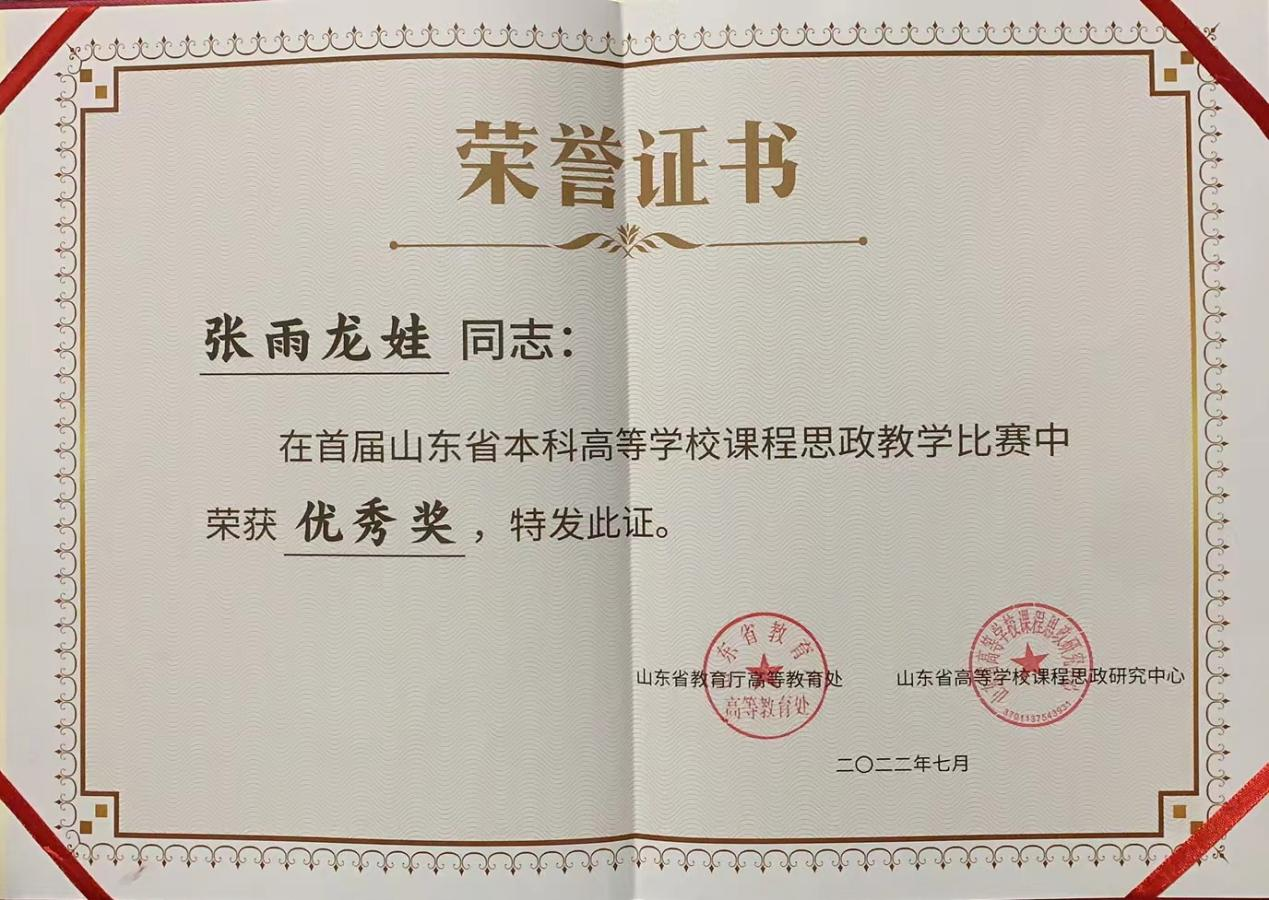 张雨龙娃教师在首届山东省本科高等学校课程思政教学比赛中荣获优秀奖