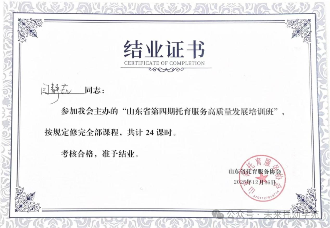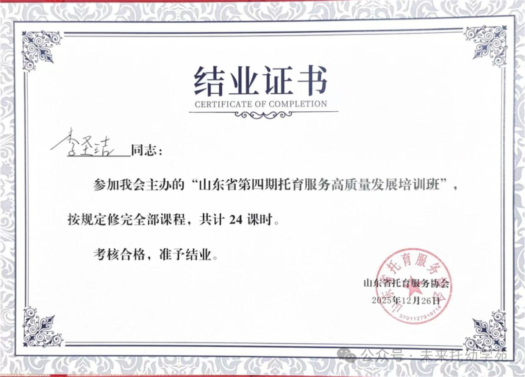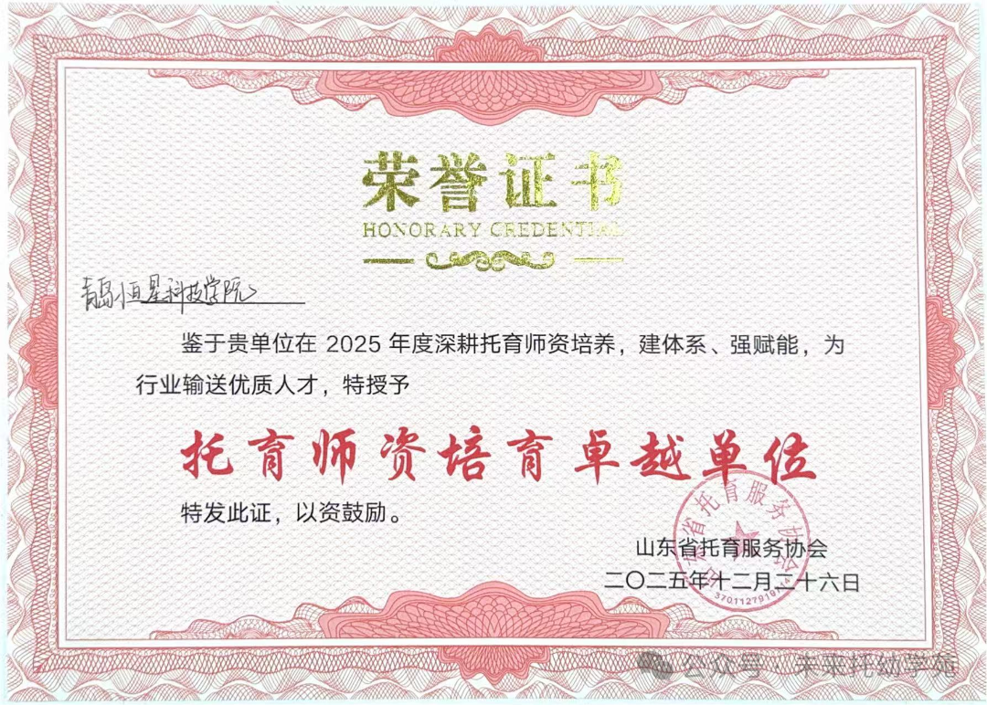 2025年12月26日,山东省第四期托育服务高质量发展培训班圆满收官,青岛恒星科技学院未来教育学院托幼学院闫静茹、李圣洁两位教师以优异成绩完成全部课程并通过考核,获颁托育服务协会认证结业证书。在同期举行的表彰大会上,学校被授予“托育师资培育卓越单位”荣誉称号,标志着其在托育领域人才培养的卓越成效获得行业权威认可。