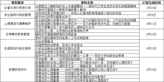 此次培训为期40天,设置“价值引领与思想引导”“学业规划与就业指导”“学业指导与班级管理”“心理调试与健康维护”“日常事务教育管理”“疫情防控知识”六大模块。在此培训环节上设置了“共抗疫情、爱国力行”等系列主题研讨活动和4次主题形式的直播互动答疑,搭建起思政工作领域专家、全国高校辅导员年度人物与广大高校辅导员交流研讨平台。
