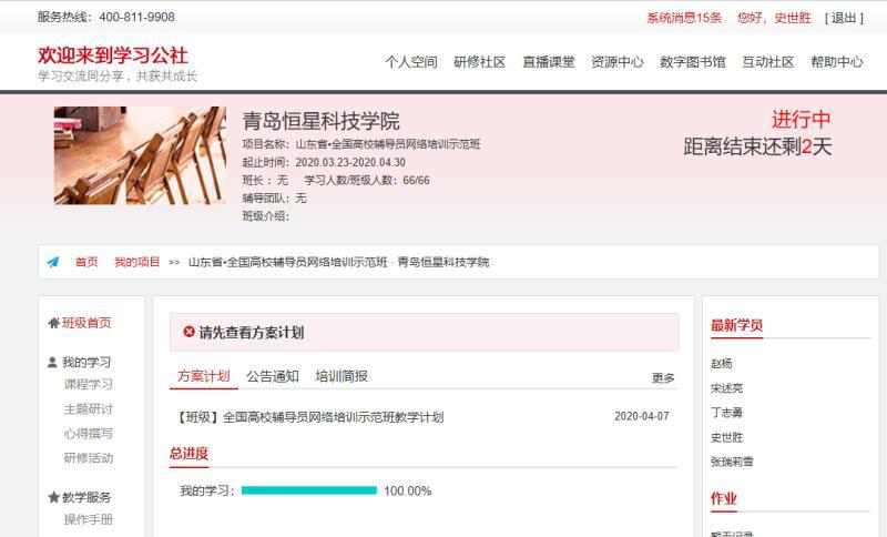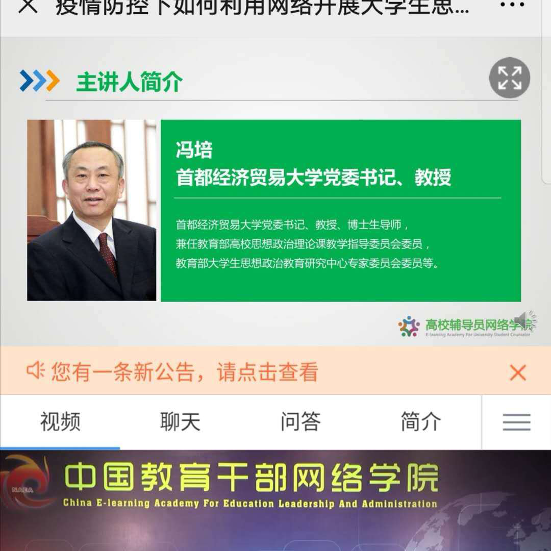 为深入贯彻落实习近平总书记系列重要指示精神和党中央决策部署,统筹推进当前教育系统疫情防控和学生思想政治教育工作。也是为推动学院辅导员队伍专业化、职业化发展,有效提升辅导员思想政治素质和业务能力,学校组织了各二级学院辅导员参加了以“共抗疫情显担当,爱国力行育新人”为主题的全国高校辅导员网络培训示范班。