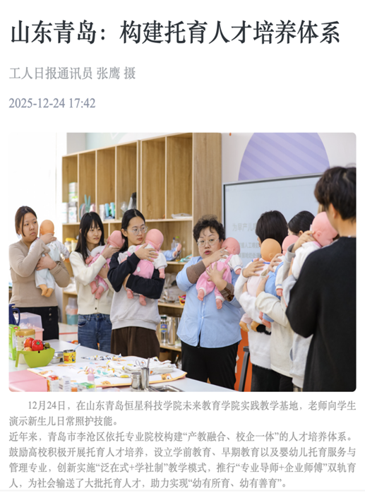 青岛恒星科技学院自2000年创办以来,一直秉持“成就他人,幸福你我”的教育理念,为社会培养了18万优秀的大学生。近年来,学校在集团的打力支持下,逐步构建了一个涵盖托育教育、学前教育、基础教育、职业教育、高等教育、成人教育和老年教育的全生命链教育的完整教育体系。尤其是学校利用自有的教育资源,建设的0-3岁托育服务中心,2024年4月获得了全国总工会、国家卫生健康委员会联合授予的100家2023年全国爱心托育用人单位称号、2022年1月获得了山东省卫生健康委员会授予的省级示范性托育服务机构称号、2021年1月获得了青岛市卫生健康委员会授予的青岛市首批市级托育示范机构称号。2023年6月全国政协沈跃跃副主席在青岛市调研托育工作时对学校校举办的“托育服务中心”工作给予了充分的肯定,2024年6月28日《人民日报》在健康专版以“因地制宜提升托育服务质量”对我校的托育服务中心给予了隆重的专题报道,2024年10月获得了青岛恒星科技学院教学成果奖特等奖,2025年11月6日新华社以“青岛市李沧区依托高校建立托育机构,打造优质普惠托育服务体系”连续3次报道学院托育服务中心取得的成绩。