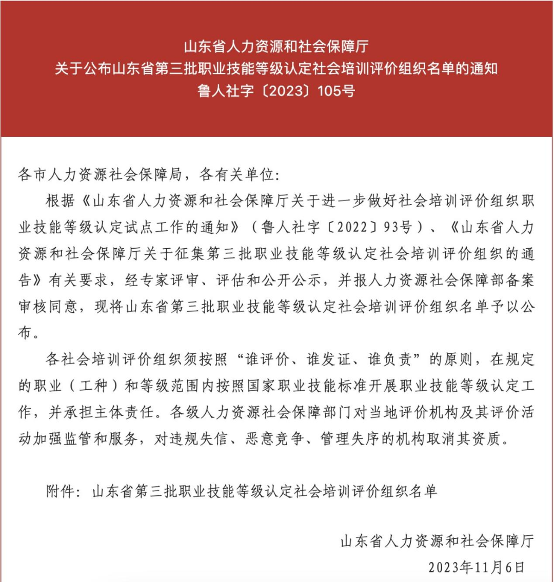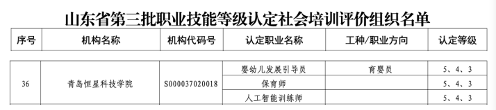 根据《山东省人力资源和社会保障厅关于开展社会培训评价组织职业技能等级认定试点工作的通知》(鲁人社字〔2023〕105号)有关要求,经专家评审、评估和公开公示,并报人力资源社会保障部备案审核同意,我校获批山东省第三批职业技能等级认定社会培训评价组织,具有婴幼儿发展引导员、保育师、人工智能训练师等3个职业(工种)初级、中级、高级的认定资格,将面向社会人员和在校学生开展职业技能等级认定工作。