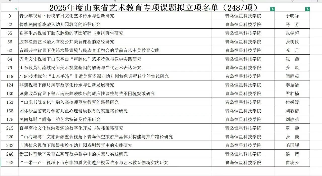 近日,山东省文化艺术科学协会正式公布2025年度山东省“艺术教育”专项课题立项名单,经资格审查、专家评审、公示等严格程序,学院共有18项课题成功获批立项,立项数量在同类院校中表现亮眼,彰显了学院在艺术教育研究领域的深厚积淀与强劲实力。