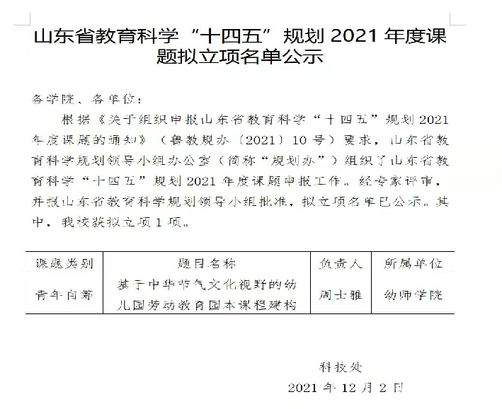 山东省教育科学“十四五”规划2021年度课 题拟立项名单公示