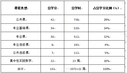 毕业最低学分:141学分。其中必修课106学分,专业选修课6学分,公共选修课7学分,实践环节22学分。