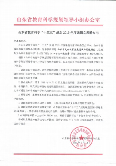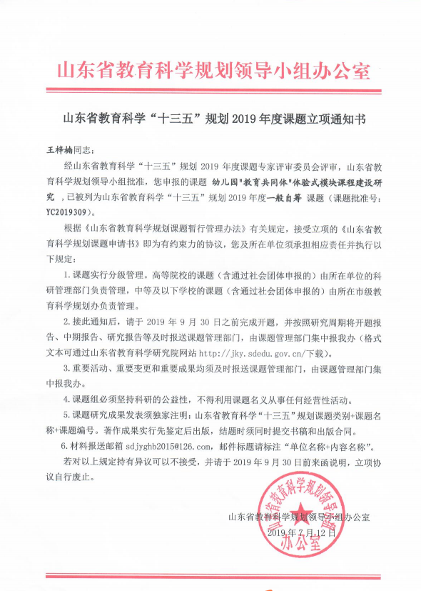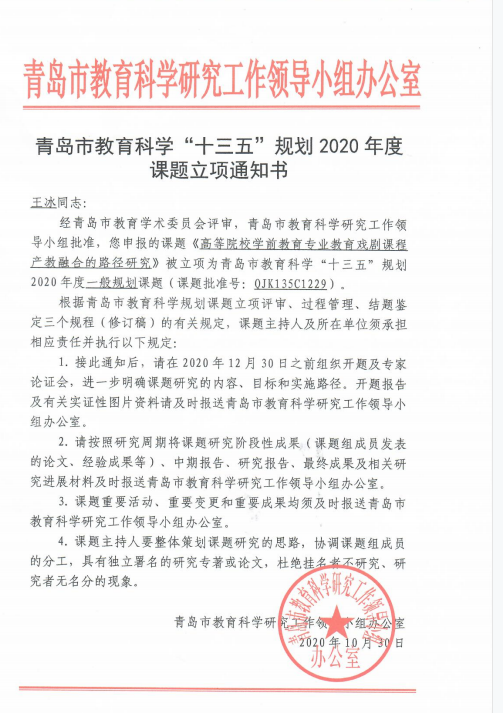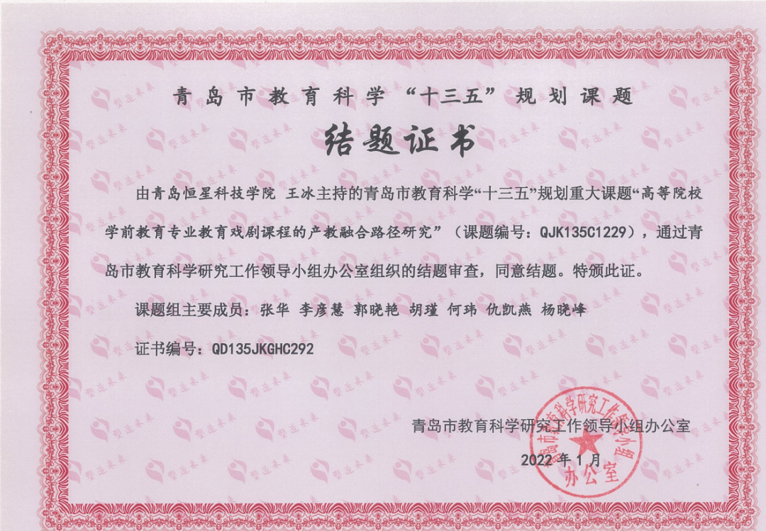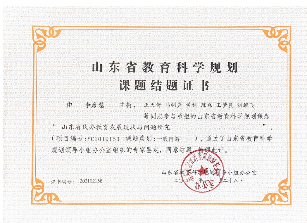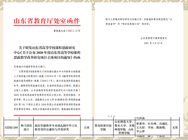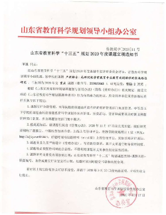 学院于2020年1月3日与教育部学校规划建设发展中心签署“未来学前教育人才培养体系”战略合作协议,并确立了“未来学前教育专业人才培养模式研究”课题级及其19个相关子课题。近三年来,学院承担高等学校省级本科一流课程1项,高等学校省级本科教改1项,山东省社会科学、教育科学规划课题各2项等多项课题教研成果。