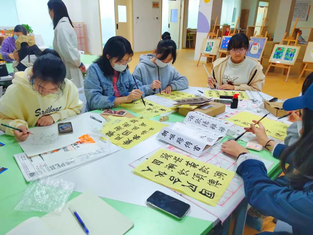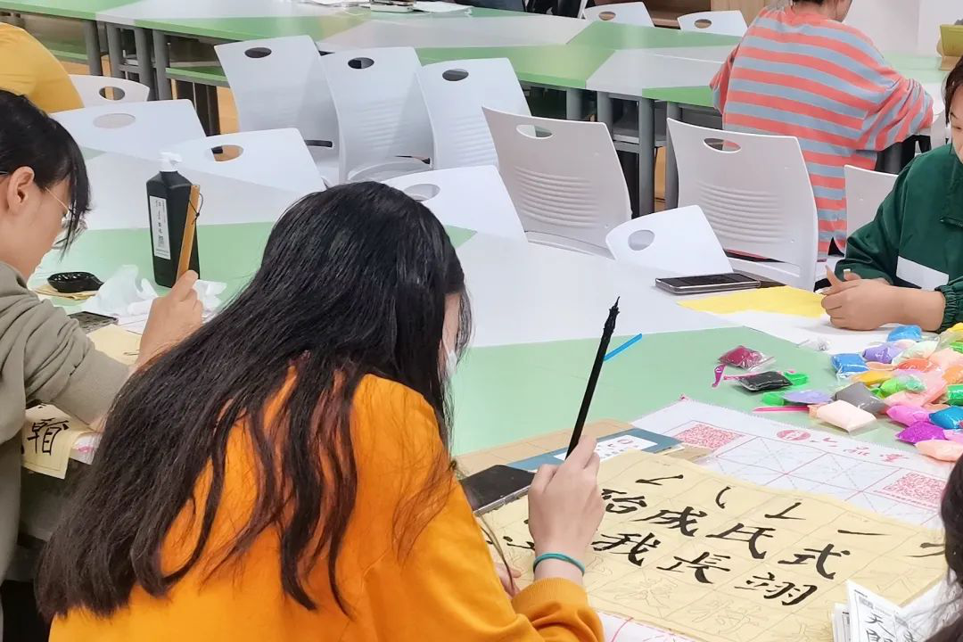 绘画组的同学用色彩和线条绘制文化元素,例如:字正腔圆、余音绕梁的京剧,千变万化、神乎其技的川剧变脸,栩栩如生、淡逸劲爽的水墨画,又或是常出现在神话故事中的仙鹤、朱雀、祥龙等代表祥瑞的动物;书法组的同学拿起毛笔,在一撇一捺中尽显国潮风采;手工组的同学用巧妙的双手制作出精致的国潮造型,结合变废为宝的思路和日常生活中的可利用的元素进行创作,最终把一幅幅可爱的黏土和国潮作品呈现出来。