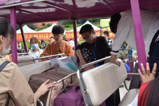 迎新工作如火如荼,到处都是忙碌的身影。新生在校门口报名登记处登记时,学长学姐们不厌其烦的回答新生们提出的各种问题。志愿者们主动帮忙拎行李,一路谈笑风生,一路介绍我们学院风采。新生细声地叫着“学长学姐”,老生们也开心地介绍学校各处,同时学院派专车接送新生,帮助同学们解决行李问题。