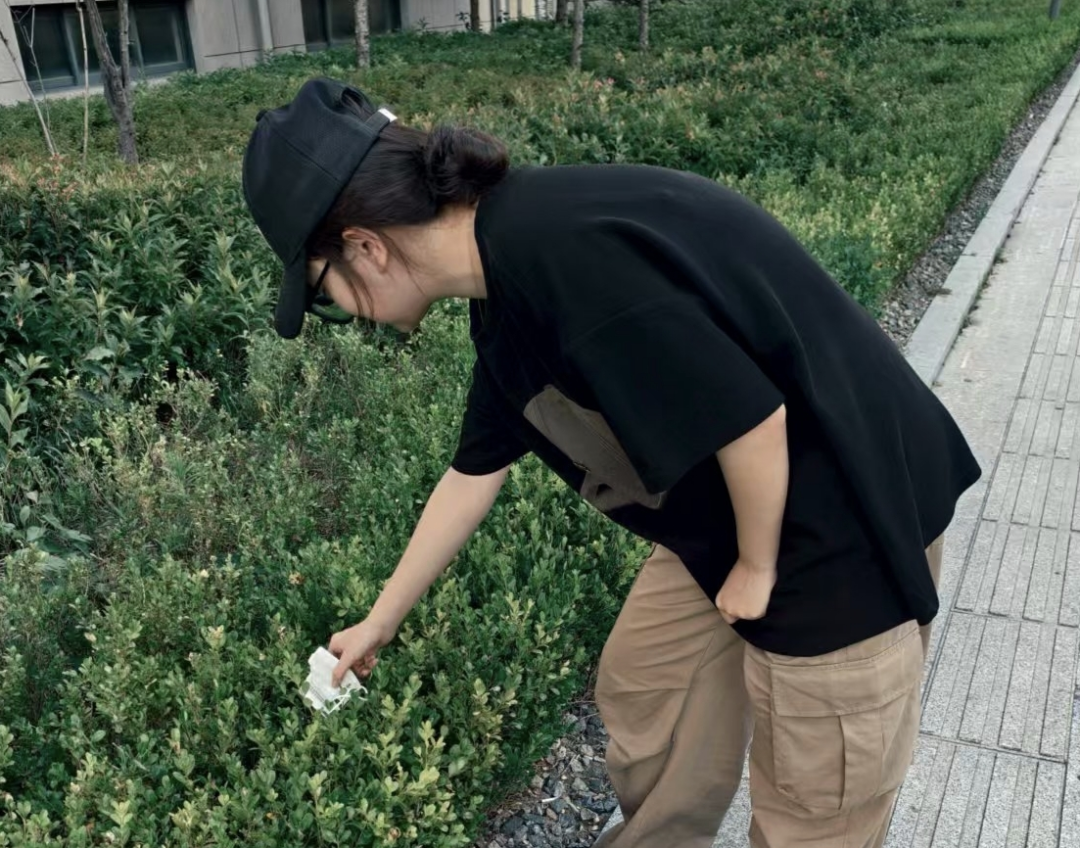 社区绿化带里,烟头、纸屑、塑料瓶等垃圾混杂其中。成员们蹲下身子,小心翼翼地将垃圾捡起,装进垃圾袋。