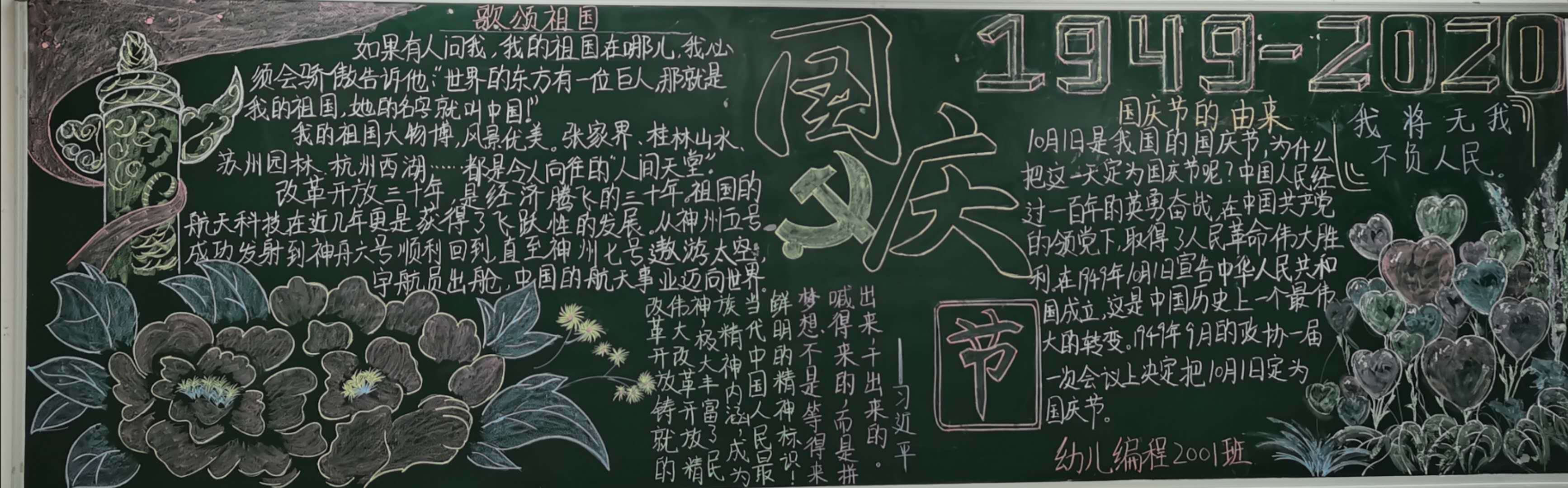 忆往昔岁月,抒爱国情怀,七十一载风雨,换来如今的和平与辉煌,今人深知其来之不易,正值金秋爱国时。为引导我校学生贯切习近平新时代中国特色社会主义思想,营造校园喜迎国庆的和谐氛围,加强爱国主义、社会主义思想教育,增强自尊、自信和自强精神,体现当代大学生的爱国情怀。青岛恒星科技学院幼师学院特于10月20日 举行了以国庆节为主题的板报活动。