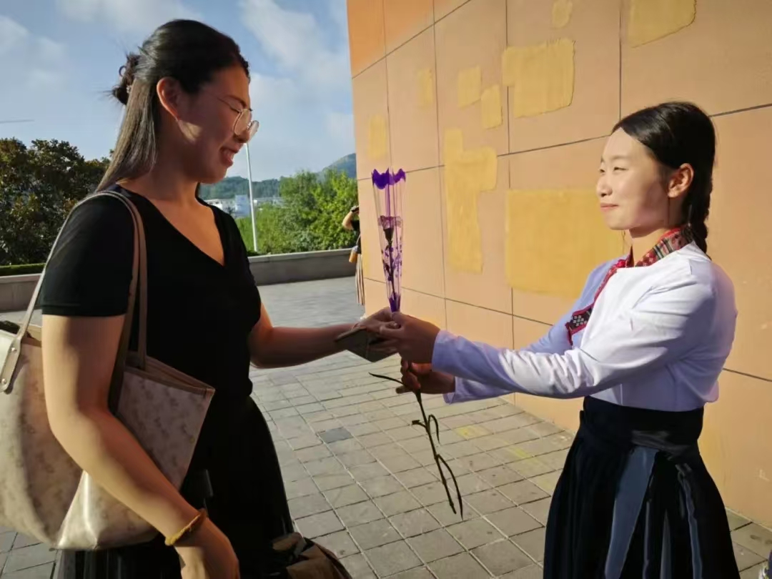 清晨,教育学院党总支书记、执行院长王清带领院务会成员和学生会干部早早等候在教学楼门口,迎接教师,为他们送上美丽鲜花,致以节日问候,浓浓暖意,温情涌动。儿童教育学院声乐学社、器乐学社、舞蹈学社的学生精心准备了《索玛阿杰鲁》演唱,非洲鼓、古筝演奏,《有我》舞蹈,用深情的才艺抒发对老师们的感激之情。