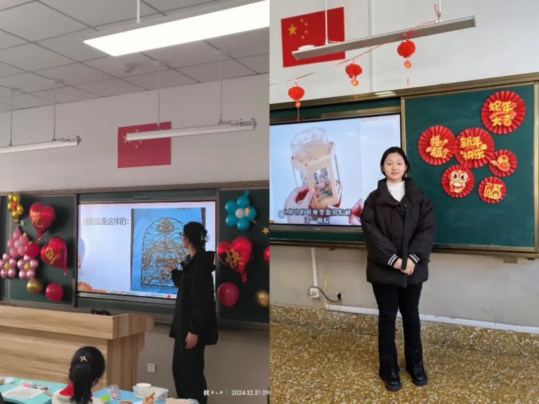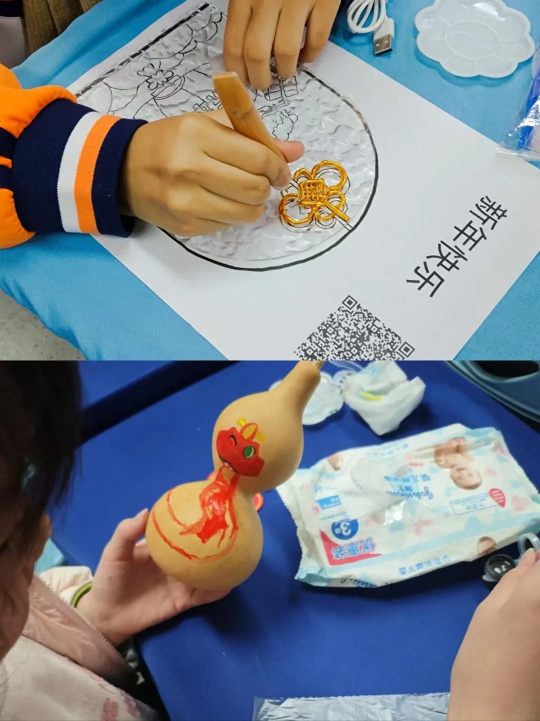 在传统工艺品环节,一间间教室仿佛变成了一个个充满创意的手工坊。大家一起动手制作精美的元旦贺卡,五彩的纸张、绚丽的画笔,描绘出对新年的美好期许;有象征着“福禄”的葫芦彩绘;还有象征团圆和吉祥的中国结融入其中,在志愿者的耐心指导下,一根根金丝线在小朋友们的画卷上缠绕、穿梭,变成了一个个精致喜庆的中国结,寓意着新的一年红红火火、吉祥如意。