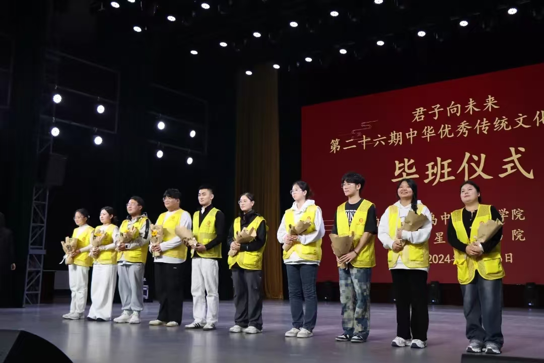 闭幕式伊始,优秀学员代表上台发言,学员们分享了培训过程的心得感受,并针对如何在新时代传承与弘扬中华民族传统文化表达自己的看法。接着,教育学院党总支书记兼教学院长张雨龙娃以本次研修学习为契机,向学员们提出三点期望。一是做传统文化的“保护者”,守好中华文脉,筑牢文化传承的根基;二是做传统文化的“推行者”,坚定文化自信,发挥交流的沟通力;三是做传统文化的“践行者”,把学习的成果落实到日常工作和生活中。随后,教育学院党总支副书记、团总支书记王柏杨带领全体师生共同宣读“恒星传统文化研修六点共识”,呼吁全体恒星人力行传统文化,养成君子品格!最后,教育学院的全体师生对一直默默奉献、辛勤耕耘的领导、老师以及志愿者们表示真诚的感谢,感谢他们在培训历程中如明灯般的陪伴,如春雨般的付出。