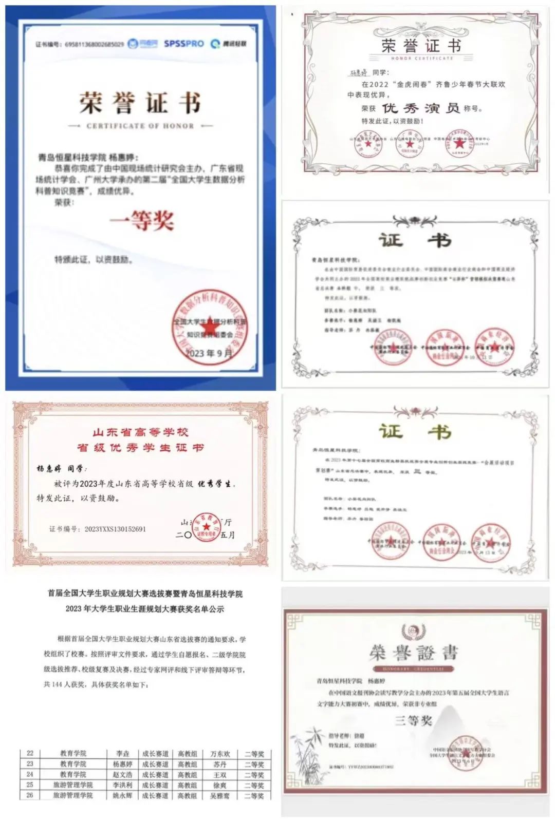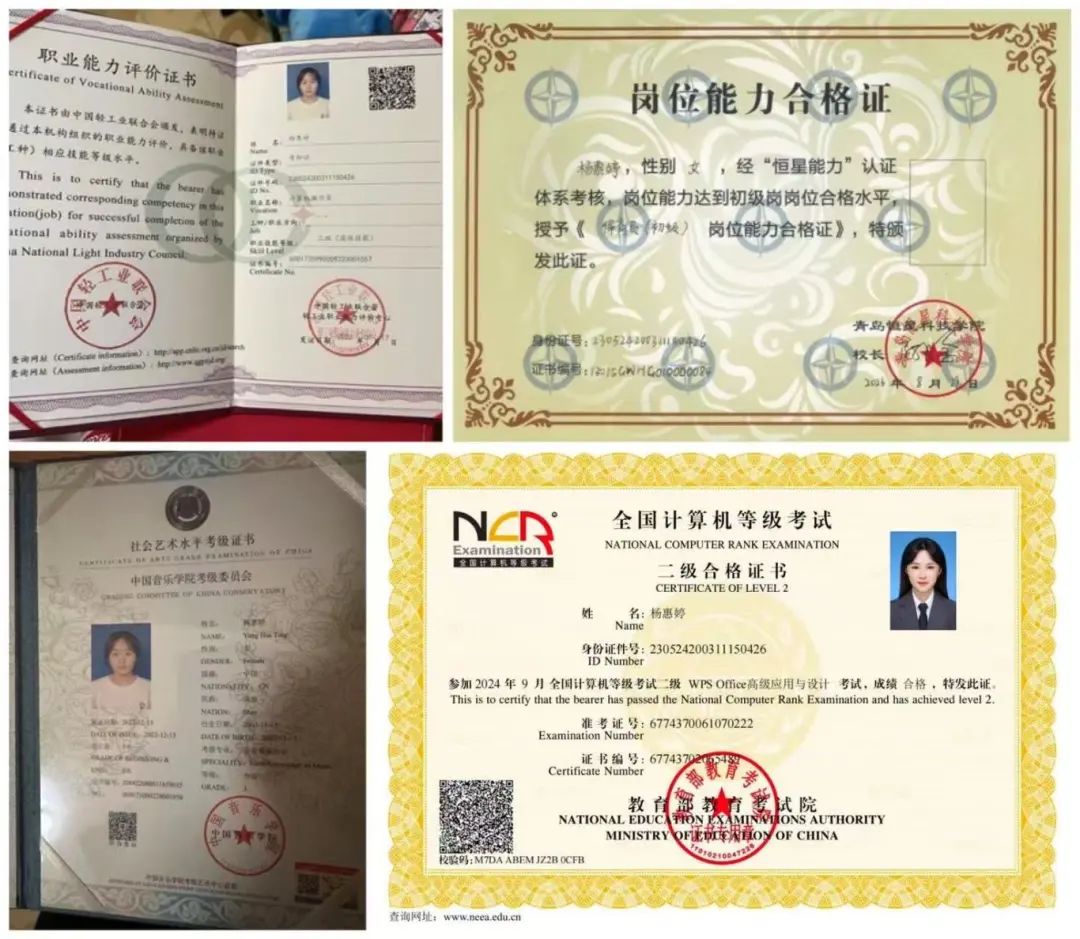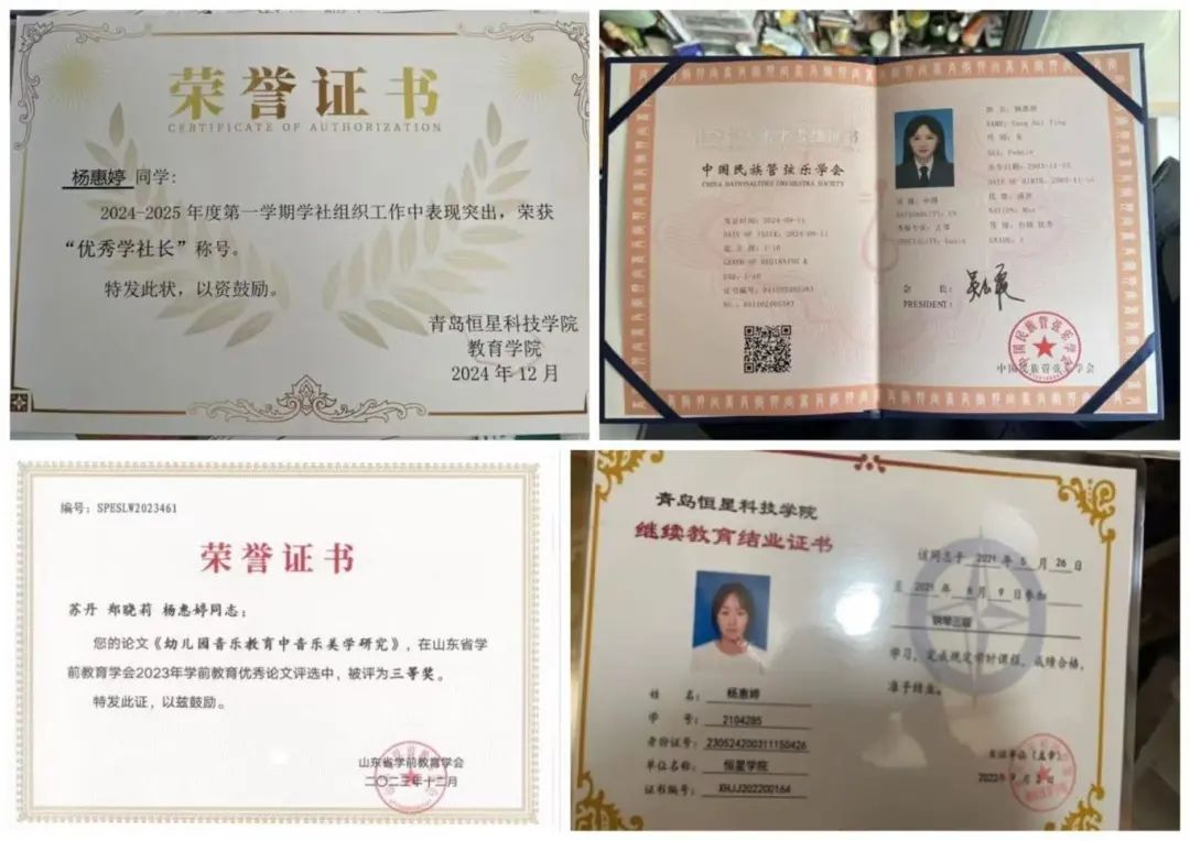 杨惠婷在学术、艺术与学生工作等领域皆成绩斐然。国家级赛事中,她在汇聚全国高校精英的数据分析科普知识竞赛中斩获一等奖,展现出扎实的专业功底与卓越的思维能力;省级层面,她不仅以优异的学业成绩与综合素养获评山东省优秀学生,还在齐鲁少年春晚的舞台上凭借精湛表演成为优秀演员;校级舞台上,她在职业规划大赛中获二等奖,清晰规划职业路径,同时作为优秀主席,成功引领部门蓬勃发展,丰富校园文化生活。这些荣誉见证着她一路的拼搏与成长,激励她不断奋进。