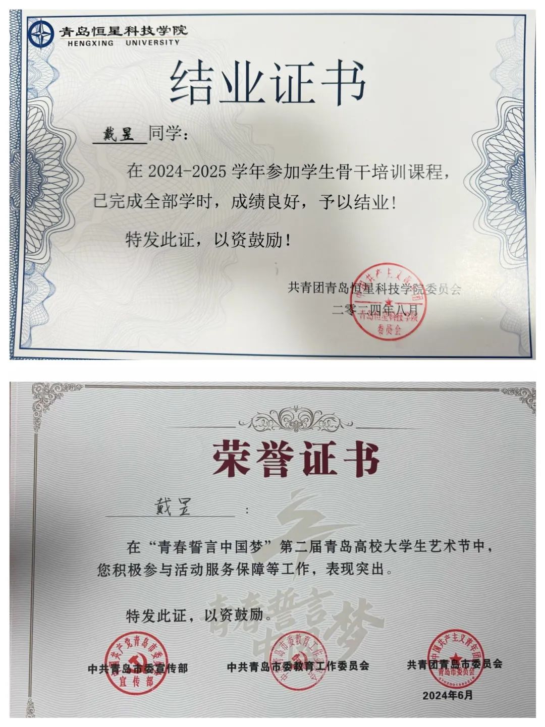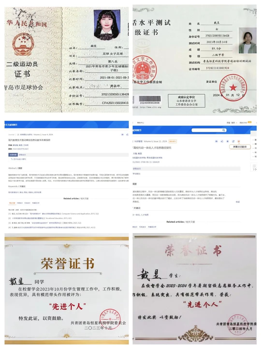 戴昱,2023级早期教育专科1班。现任校督学会秘书处部长,曾获青岛时尚体育季团体三等奖等称号。参加暑假寒假三下乡,在社区志愿服务期间,担任活动负责人。自入学以来,积极参与计算机软件著作,并发表论文2篇。同时积极参加社会实践志愿服务,志愿汇信用时数115.38小时。