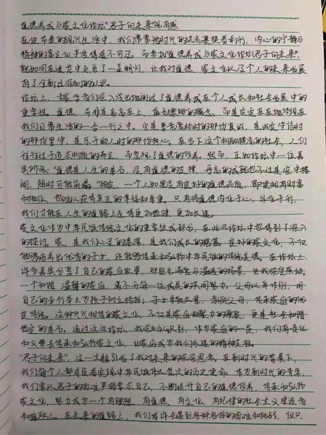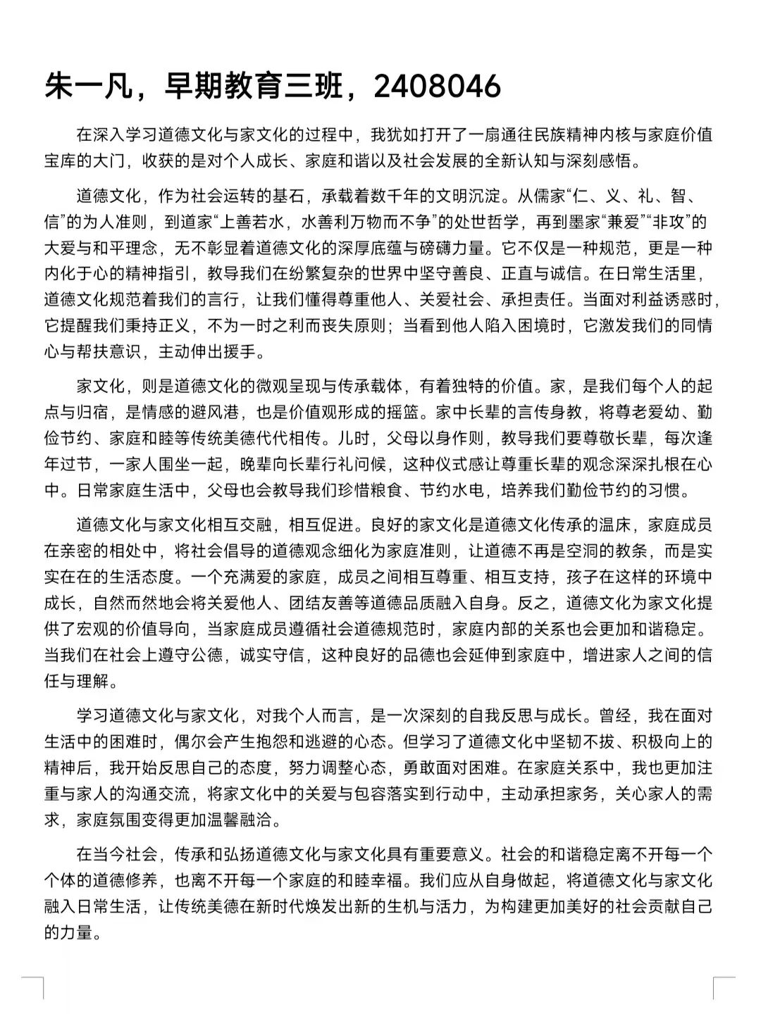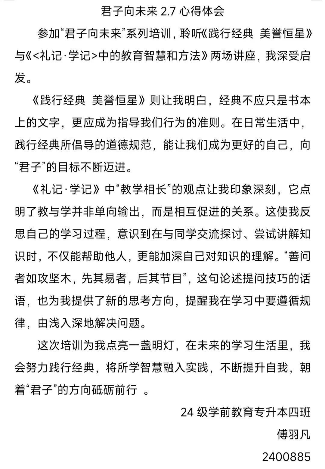 在为期五天的线上学习中,多样化的课程内容让教育学院的师生们收获颇丰。从姓氏文化中探寻家族的历史脉络,到儒家“仁”学中领悟为人处世的智慧,同学们沉浸在知识的海洋里,感受着传统文化的深厚魅力。在每天的心得体悟中,同学们从不同角度阐述对道德修养的理解,分享自己在生活中践行道德的小故事,对如何将道德教育更好地融入校园文化提出了独特的见解。