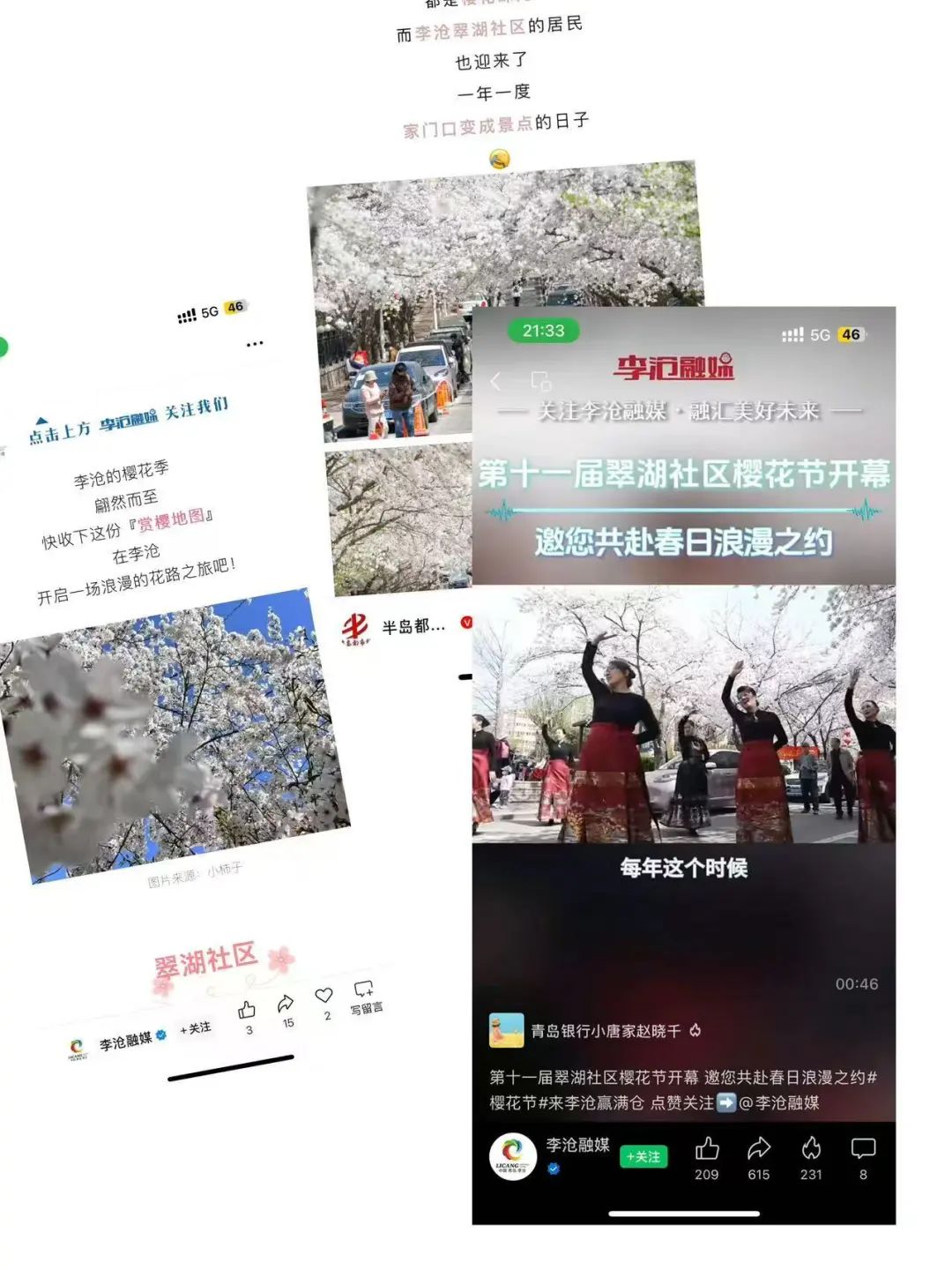 本届樱花节上,800 株樱花树绽放,形成粉色花海,将社区装点成梦幻仙境,吸引了大量市民游客前来观赏春光与樱花盛景。此次樱花节不仅为市民提供了欣赏美景的机会,打造了城市文化名片,还是一场将优秀传统文化与铸牢中华民族共同体意识深度融合的生动实践。此外,半岛都市报、大众日报、搜狐网、微信公众平台、信网等众多媒体纷纷对樱花节进行报道,报道内容主要围绕樱花节开幕的消息、社区樱花盛开的美景,部分报道还提及活动背后的文化意义 。