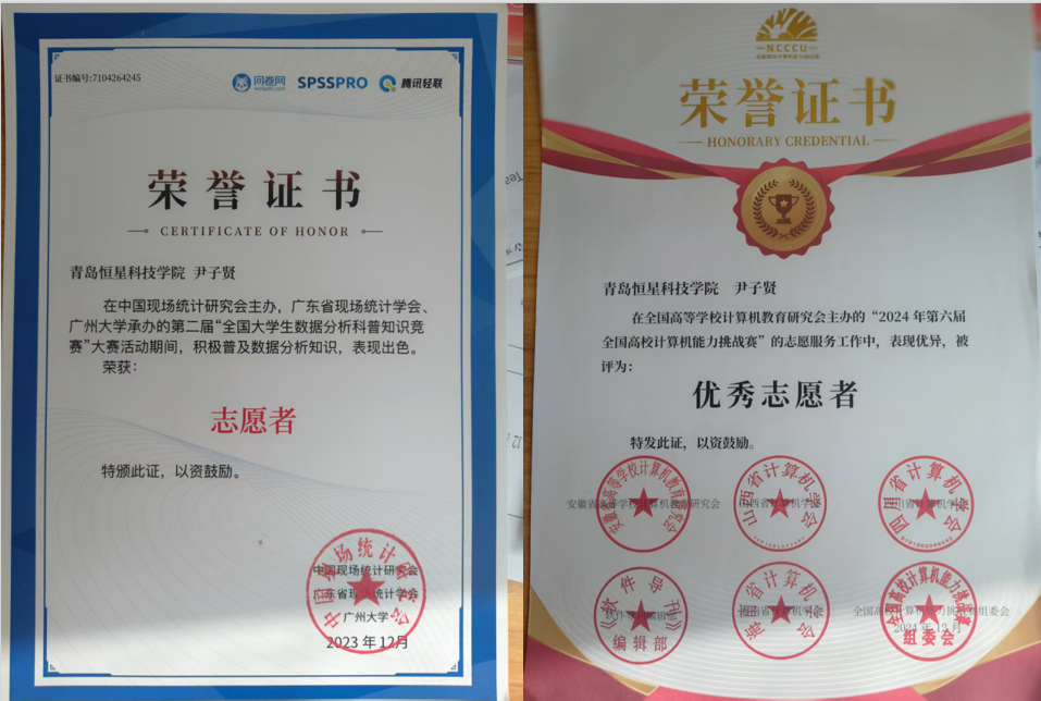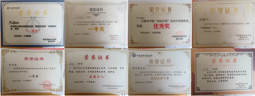 在生活中,尹子贤始终保持积极向上的心态,乐于助人,积极参与志愿者活动,志愿汇累计时长达79.57小时。她曾参加2024年寒假返家乡大学生社会实践活动,并荣获“院级一等奖”“校级一等奖”等奖项。她用实际行动诠释了新时代青年的社会责任感与使命感。