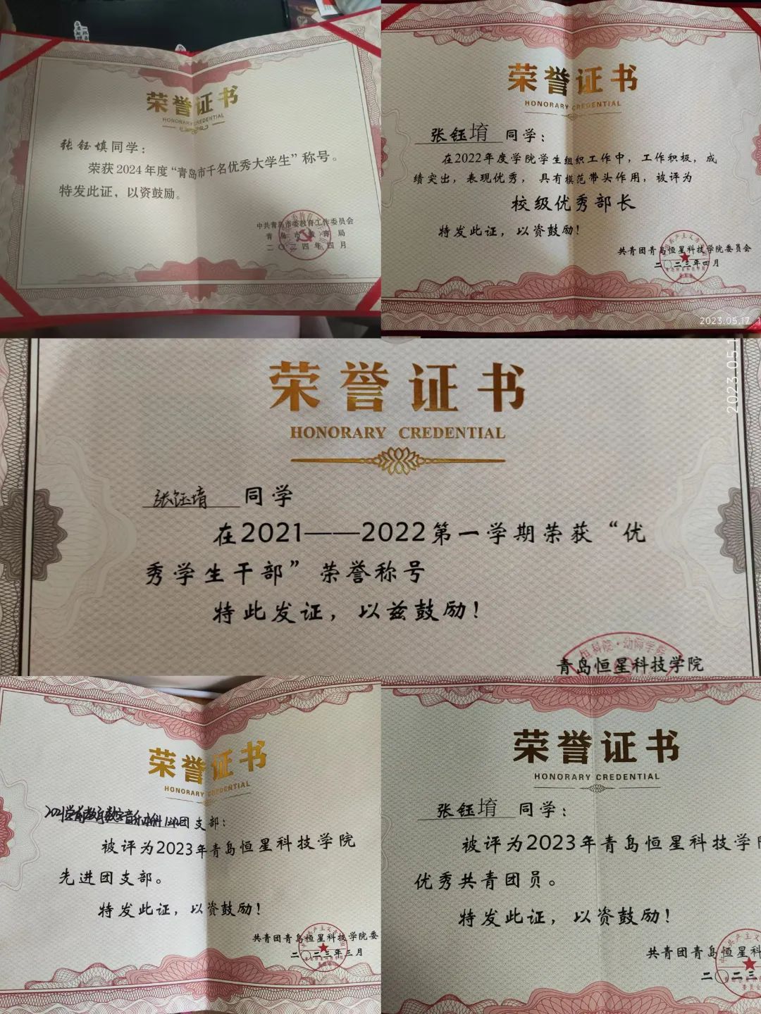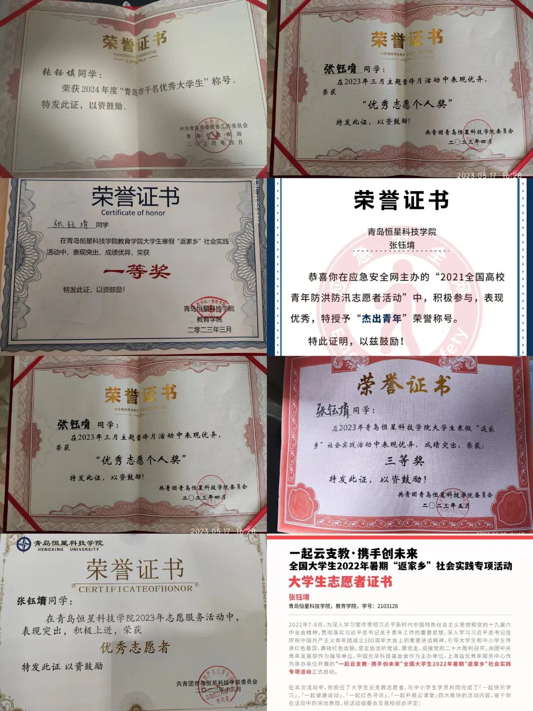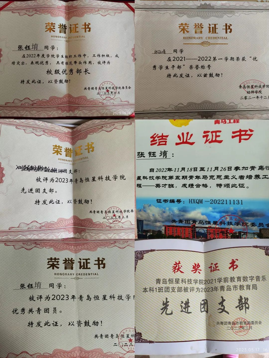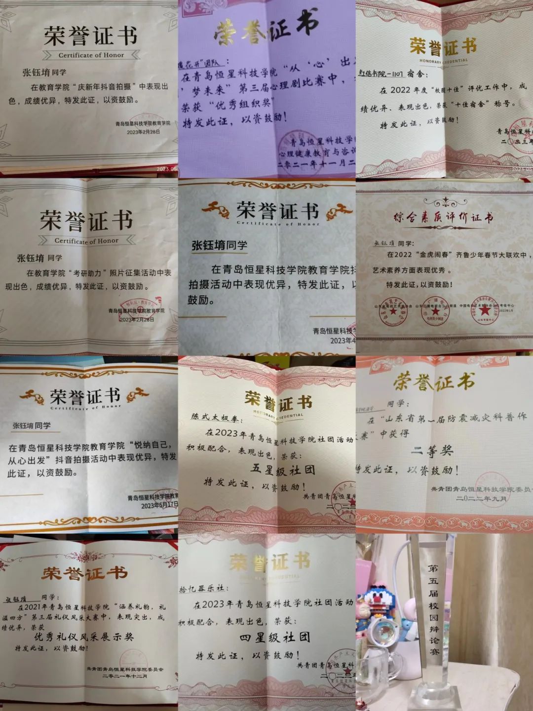 张钰堉曾担任教育学院学生会行政主席和学社社级长,在学生会工作的三年里,她踏实肯干,高效完成各项任务,组织承办了学院辩论赛等活动,荣获最佳组织奖项。曾协助老师完成贫困资助、学籍档案管理、毕业生毕业流程、表格资料整理等工作,积极参与学校幼儿园和学籍科的学社工作。她充分发挥学生党员的模范带头作用,带领所在部门积极为老师和同学服务,荣获“青岛市千名优秀大学生”、“优秀学生干部”、“优秀共青团员”等荣誉称号。这些经历不仅提升了她的组织和协调能力,也增强了她的责任感和集体主义精神。
