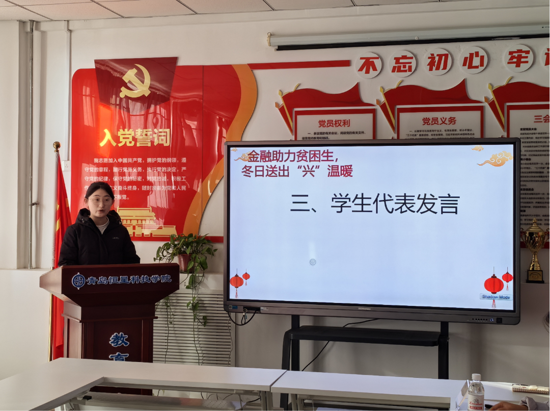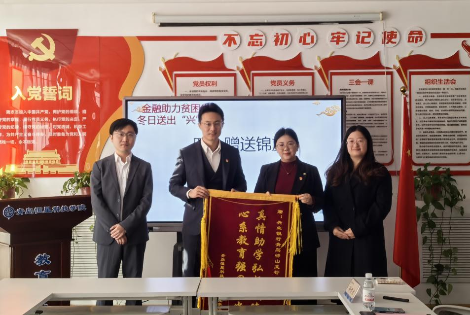 活动开始,张雨龙娃书记向与会人员介绍了学院党支部的基本情况,同时讲解了资助困难学生的重要性及意义,表示学院高度关注家庭经济困难学生的帮扶工作,希望同学们常怀感恩之心,合理合规使用资助资金及物品,自立自强,更加专注于学习和个人发展。随后,孔海琪行长助理围绕兴业银行成立历史及发展作介绍,并表示希望通过此次活动,让每一位学生在这个寒冷的季节里都能感受到家的温暖,让爱与关怀成为我们共同前行的力量。同时,他期待与教育学院携手,通过党建共建等多种形式和载体,共同培养出更多有情怀、有能力、有担当的未来教育者。接着闫玉静作为学生代表积极回应,她表示感谢学院以及兴业银行的关怀与帮助,并表示会将这份感恩化作前进的动力,在学习上更加勤奋刻苦,积极参加各项实践活动,提升自己的综合素质,不辜负学校、学院的栽培,不忘党和国家的殷切厚望。最后,教育学院师生发起倡议,为兴业银行青岛崂山支行送上锦旗,“真情助学弘扬美德,心系教育强国担当”,字字饱含着真挚的感谢。