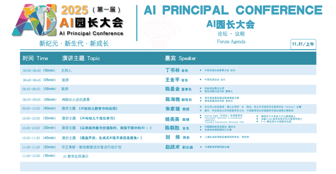 1. 探讨AI在教育中的应用 为教育工作者和AI专家提供交流平台,共同探讨人工智能在幼儿园管理、教学模式转变以及教育创新等方面的应用,为教育未来发展指明方向。 2. 人工智能教育与人才培养 深入探讨AI教育的发展现状与挑战,包括课程设置、教学方法、师资培养等,分享AI人才培养的成功案例,促进教育与产业需求的对接。 3. 展示AI教育应用成果 集中展示AI教育应用成果,同时也是对教育现代化的深入探讨和实践,提升教育效率和个性化程度,构建更加灵活开放的学习环境。 4. 推动教育改革 通过讨论AI对教育的变革、挑战与未来,助力教育界抓住AI带来的机遇,推动教育改革,培养适应未来、引领创新的AI时代人才,为教育的未来发展开辟更广阔的空间。 5. AI相关政策法规与监管 分析国内外关于AI的政策法规动态,包括数据保护、知识产权、责任归属等,讨论如何建立有效的监管机制,保障AI技术的健康发展。 6. 促进产学研用融合 邀请知名院士、业内专家及名校校长、名园园长参与,促进学术界、产业界和教育界的深度融合,形成产、学、研用的良性循环,推动AI教育技术的快速发展和应用。