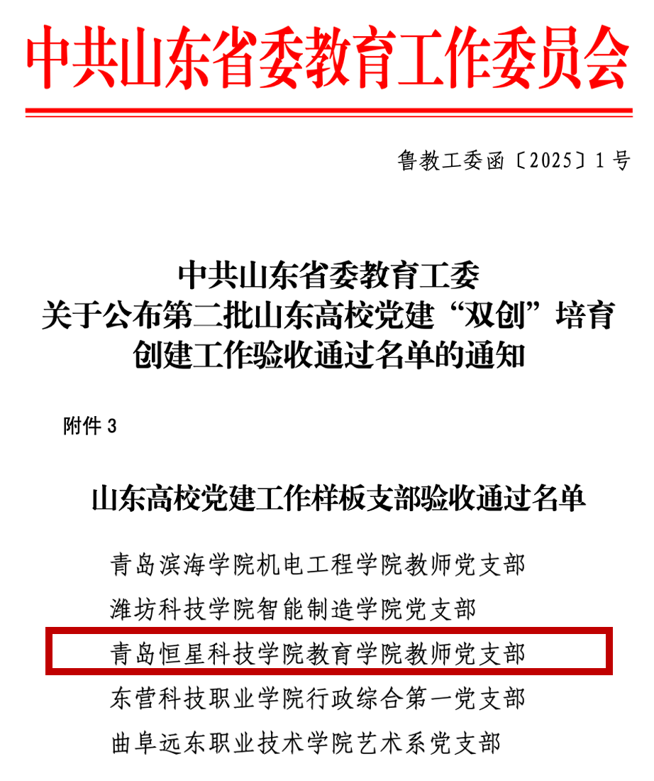 2025年,我校教育学院教师党支部顺利通过山东省委教育工委“山东党建工作样板支部”验收。自2021年11月申报全省党建工作样板支部以来,教育学院教师党支部紧紧围绕立德树人根本任务,对标创建申报目标与内容,持续打造“倾情育火种,共筑幼教梦”的党建品牌。2022年顺利获批山东省党建工作样板支部创建单位,经过3年的建设培育,2025年顺利通过验收。接下来,让我们走进“山东高校党建工作样板支部”——教育学院教师党支部。