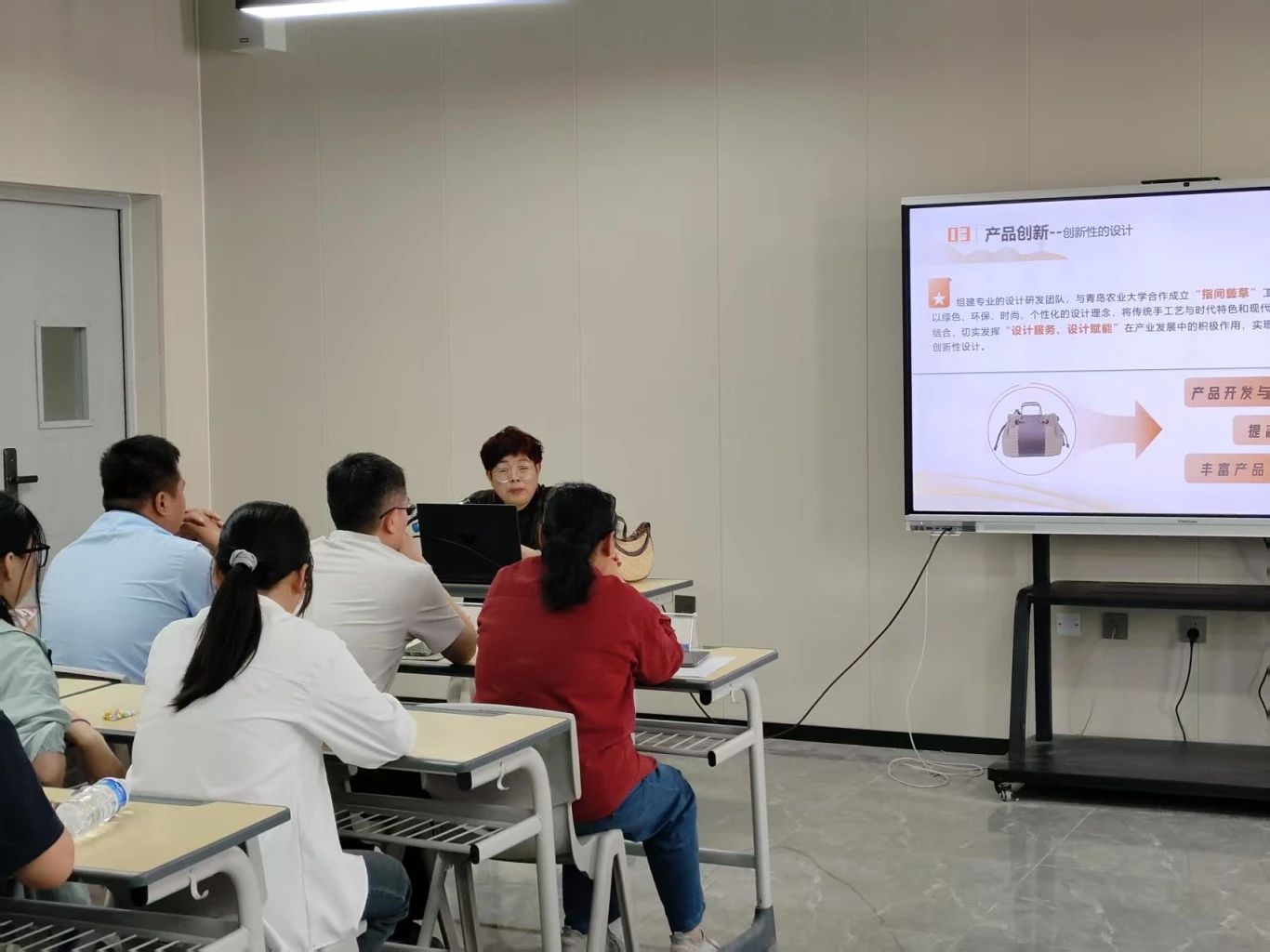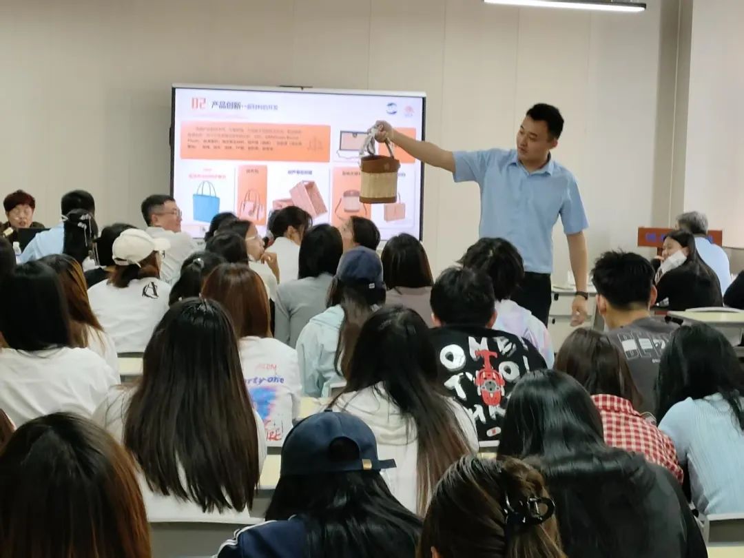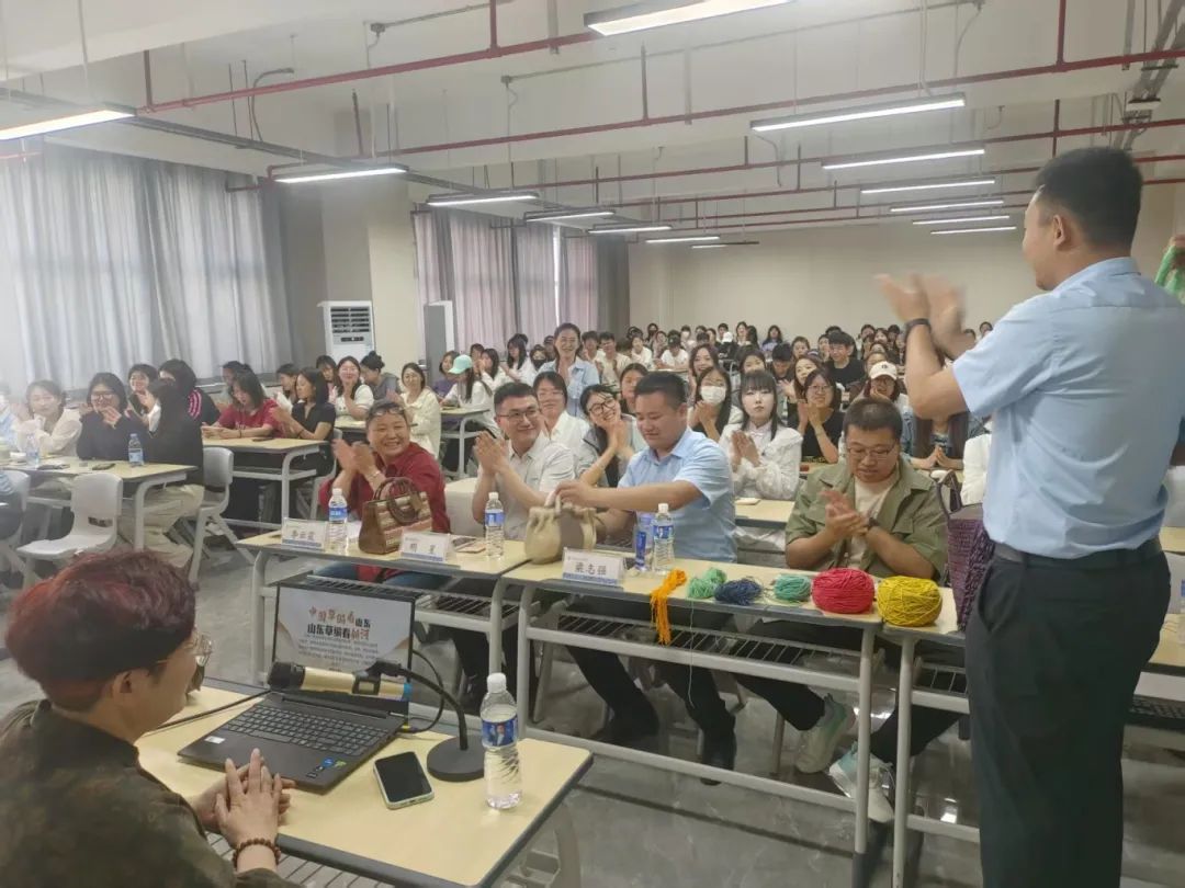 讲座中,李秋菊老师分享了新河草编的历史渊源、工艺特点及创新发展。新河草编源于民间,以麦秆、蒲草等天然材料编织而成,曾是寻常百姓家的日常用品。如今,在传承人的巧思下,草编技艺与现代设计相结合,摇身一变成为时尚单品,如草编包、饰品、家居装饰等,既保留了传统韵味,又符合当代审美。李秋菊老师还分享了她在传承中创新、将草编艺术推向更广阔舞台的故事,其坚守与创新的精神深深打动了在场师生。