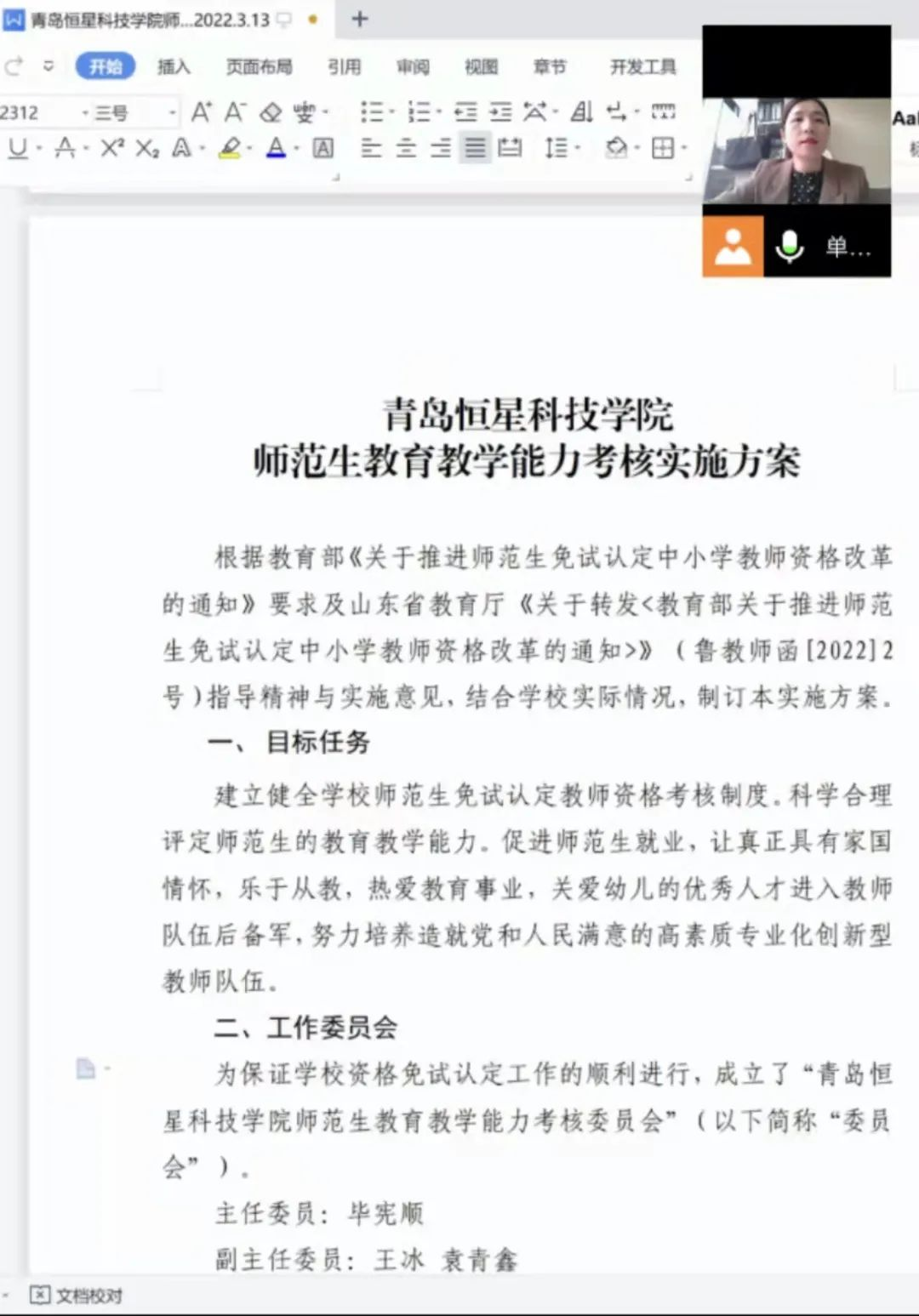 为了科学合理评定师范生的教育教学能力,让同学们积极参加本次师范生教师资格免试考试。青岛恒星科技学院幼师学院于2022年4月8日下午4点采用腾讯会议对本次师范类专业免试认定政策进行宣贯,确保每位同学应知尽知。此次线上会议由幼师学院副院长单菁华主持,教务处处长袁青鑫、幼师学院院长王冰、辅导员和毕业生参加会议。