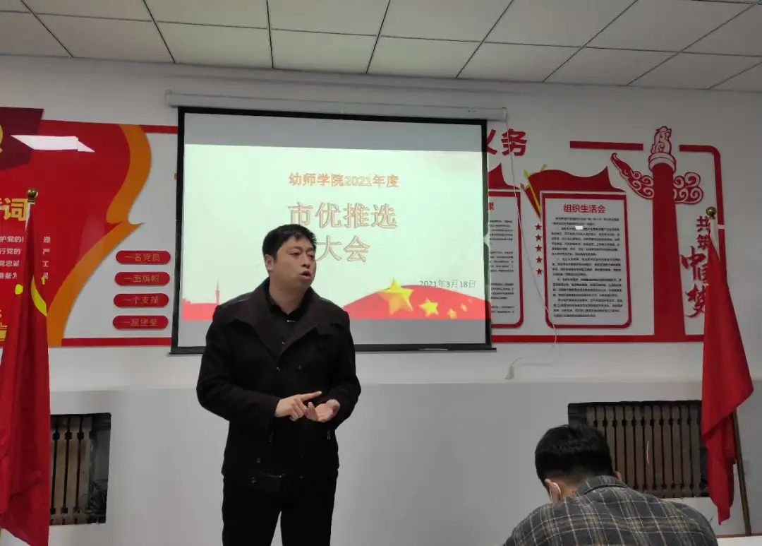 为了以良好的风貌迎接“建党一百周年”,展现教育学院优秀团员的精神风貌,激励广大团员向团组织、党组织靠拢,树立奋发向上的良好风气。青岛恒星科技学院教育学院于2021年3月18日晚上7:20在A2党建办公室举办市优推选大会。张良院长、成风老师、孔赵扬老师、王昱涵老师出席本次竞选活动。