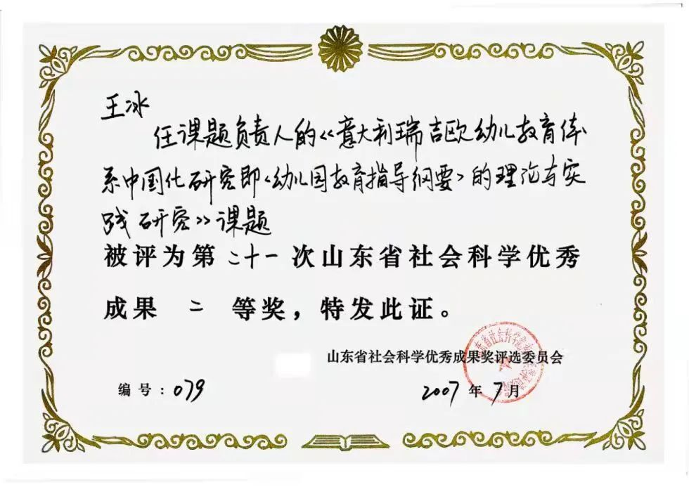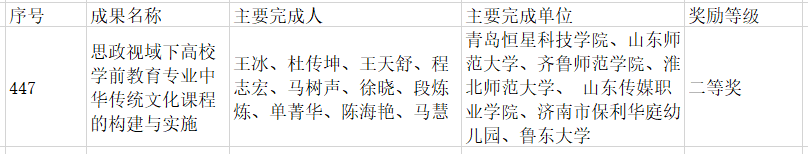 近日,山东省教育厅公布了第九届教学成果奖(高等教育类)获奖名单,由教育学院王冰院长主持的《课程思政视域下高校学前教育专业中华传统文化课程的构建与实施》获得山东省教学成果奖二等奖,是学院教学成果奖质量的一次重大提升。