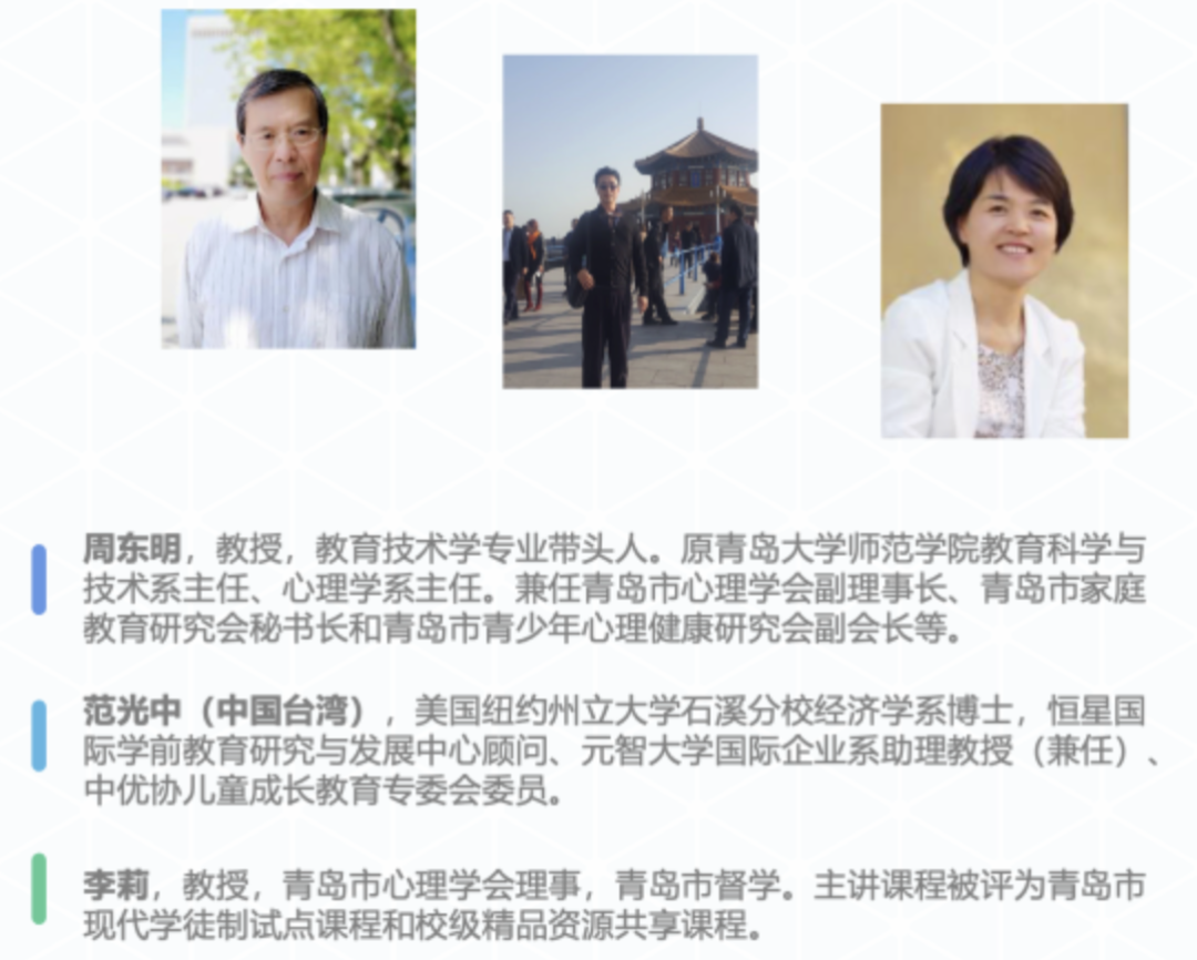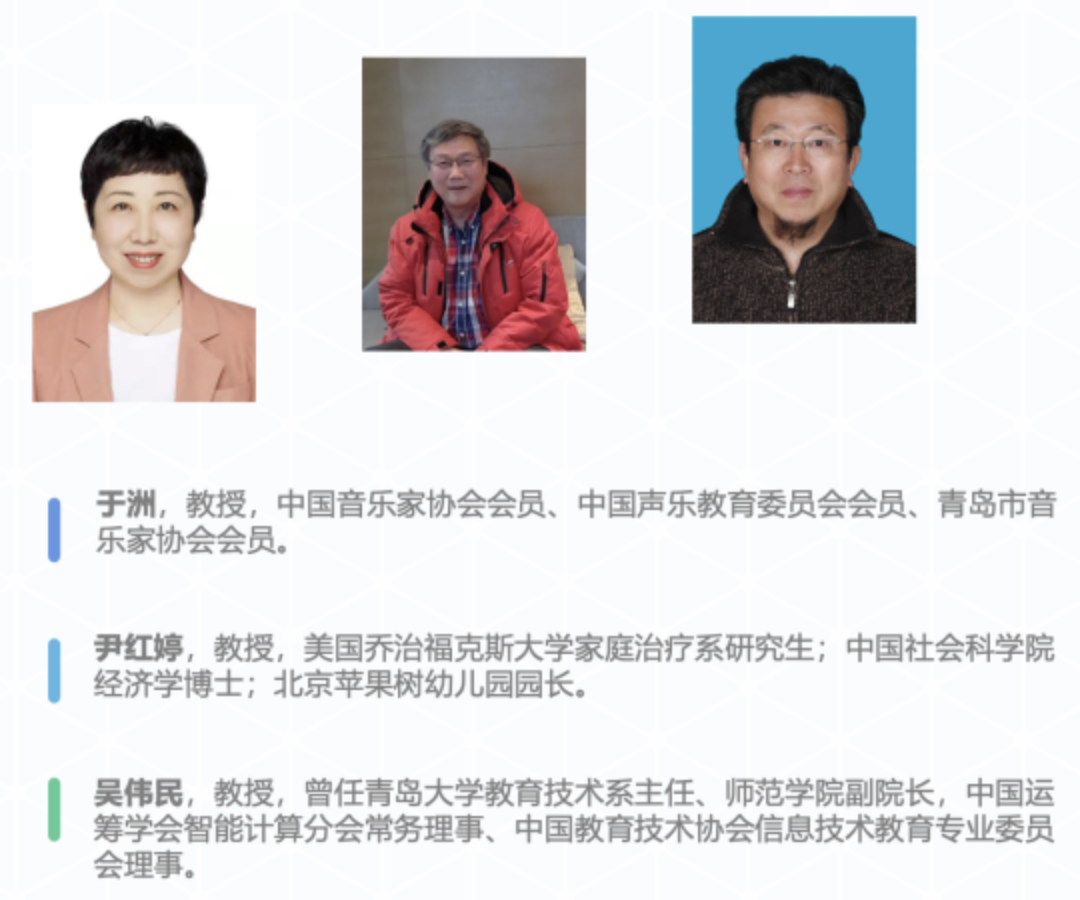 校专咨委副校级专家,原山东师范大学学前教育系主任、学前教育专业硕士研究生导师;教育部国培项目幼教组首批专家;教育部学前教育学硕士学位论文审查委员;山东省教材审查委员会幼教组组长;山东未来教育科学研究所所长;山东托育标准化研究院院长。
