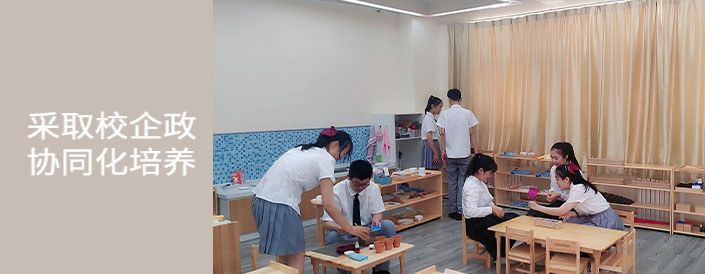 坚持“行校共建、产教融合”的办学模式,与国际知名企业北京菁英堡科技有限公司、罗兰盛世音乐教育科技有限公司、贝芽智能科技有限公司、北京可儿教育科技有限公司、陕西大千教育管理股份有限公司等国内外头部企业深度合作,坚持“做中学、学中做”,从一份教学设计、一个婴幼儿照护入手,实岗真做,实景应用式教学助力人才培养。