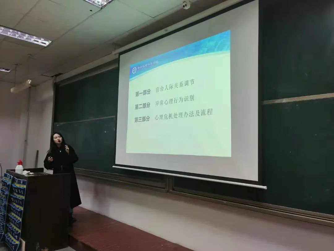 本次培训主要包括宿舍人际关系调节、异常心理行为识别和心理危机处理办法及流程三部分。当前我校设置心理健康教育与咨询中心教师——学院心理健康辅导员——学生班级心理健康委员——学生宿舍心理联络员四级危机干预队伍,其中宿舍心理联络员是重要一环。宿舍心理联络员的作用体现在:能帮助同学预防心理危机发生;能够第一时间预警心理危机;对心理危机当事人进行心理陪护,帮助其排解不良情绪;在危机后期跟踪中的作用。