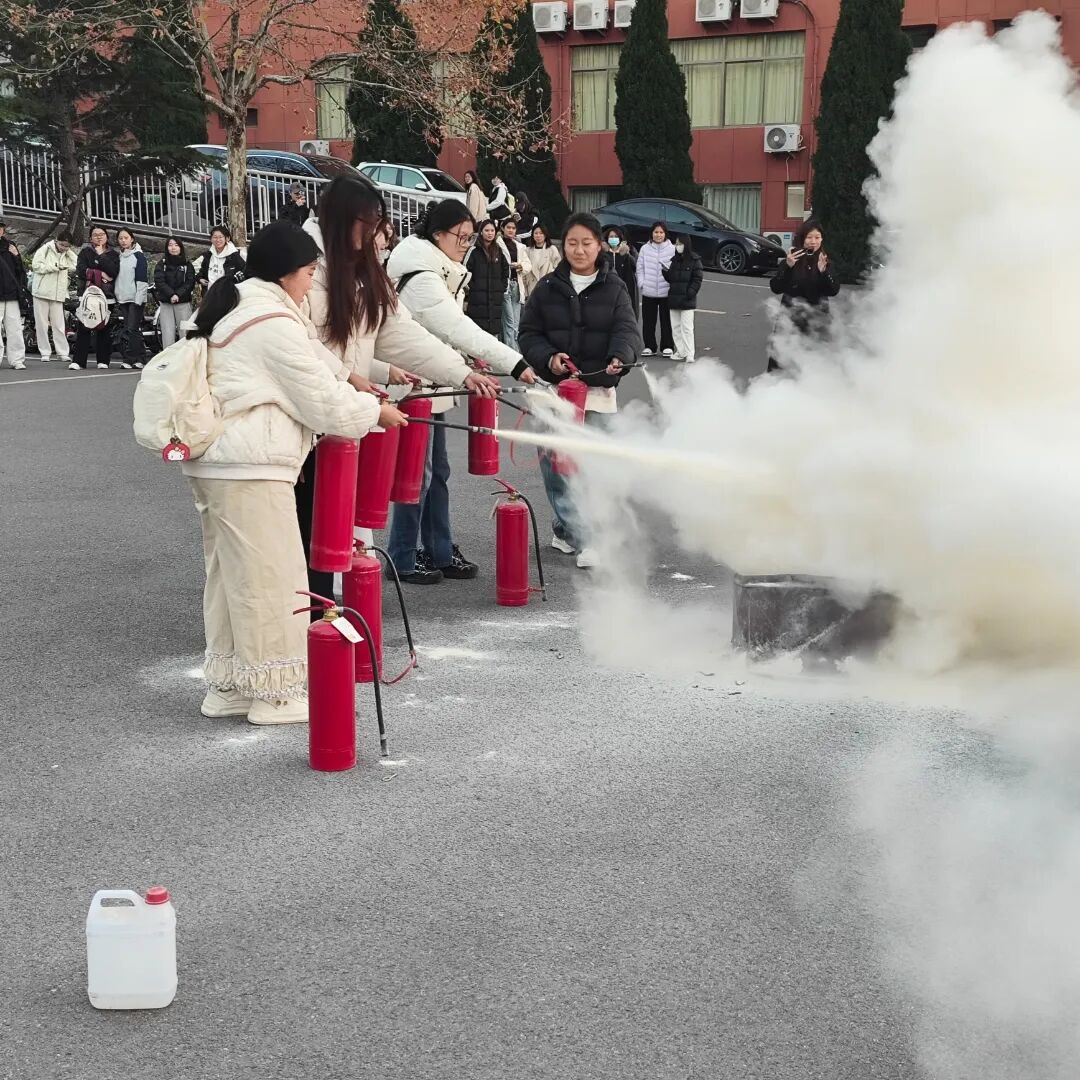 演练现场,从消防安全理论精讲到应急处置实操演示,每个环节都紧扣实战需求。专业教员通过案例分析、情景模拟等方式,系统讲解火灾风险辨识要点,现场演示灭火器"提拔握压"操作规范,组织疏散演练时特别强调"弯腰捂鼻、扶墙前行"的避险要领。同学们全神贯注观摩学习,在互动体验中掌握"发现火情-初期处置-安全撤离"的全流程应对技能,真正将"预防为主、防消结合"的安全理念转化为行动自觉。