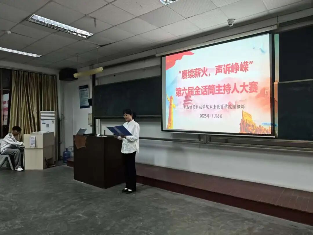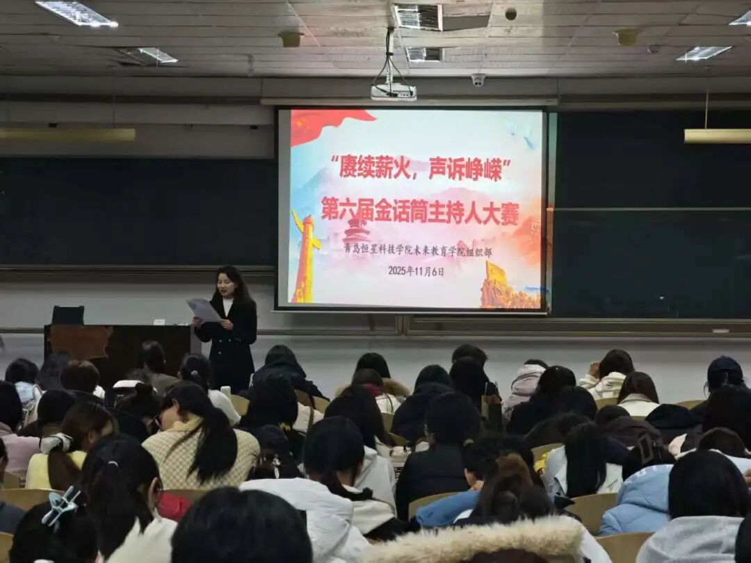 当灯光为热爱聚焦,当话筒为梦想发声,11月6日晚,青岛恒星科技学院未来教育学院第六届“赓续薪火,声诉峥嵘——纪念抗战八十周年”金话筒主持人大赛,在A4-706教室温情启幕。各位观众选手及工作人员同主持人盛汇仑,见证了一场用语言传递力量、用声音续写初心的青春盛宴。