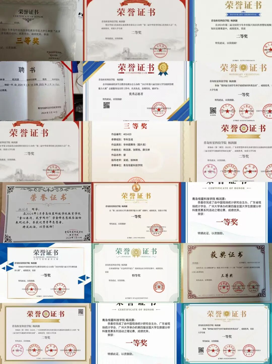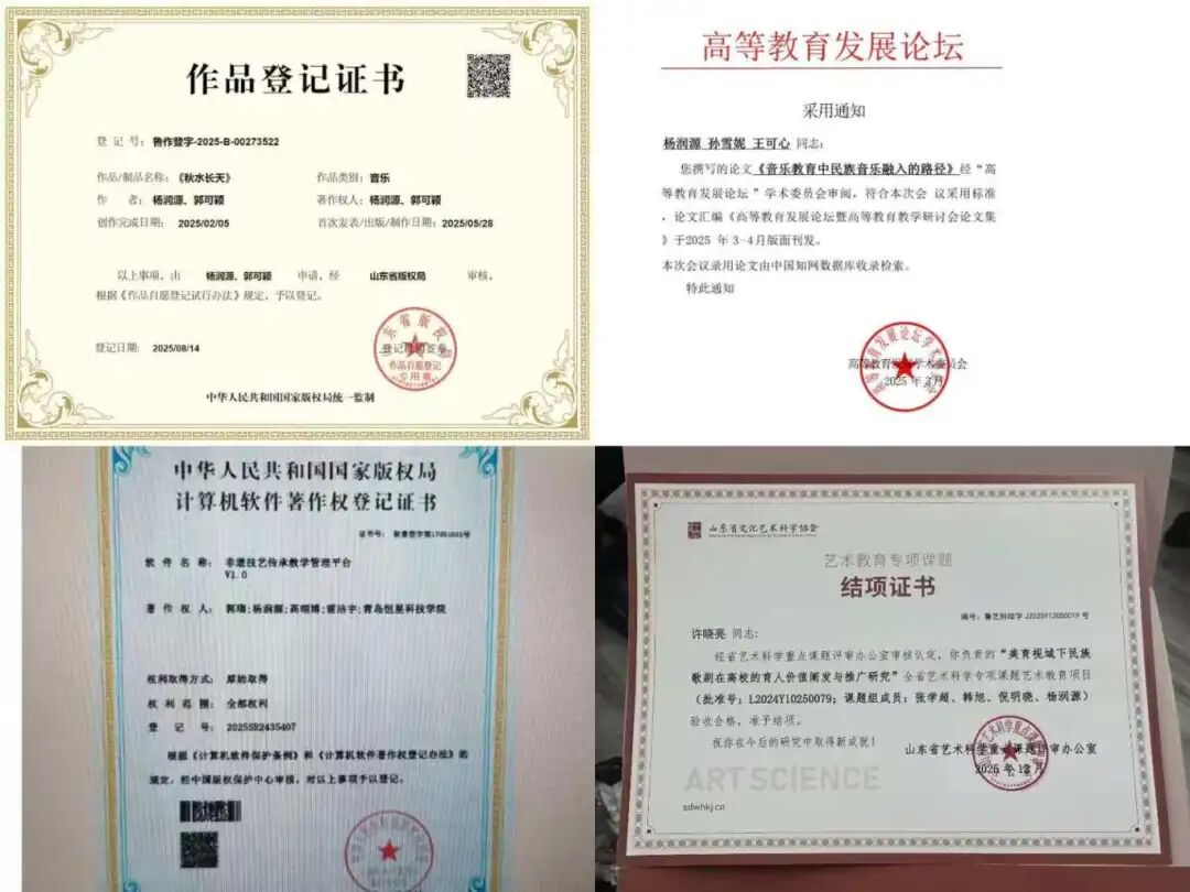 在学业上,杨润源是名副其实的‘‘佼佼者’’。前两年综合素质分与专业成绩均稳居专业第一,超16门课程成绩达到90+,斩获2024-2025学年省励志奖学金。他不仅深耕专业知识,更积极拓展学术边界,发表2篇知网论文、2篇国外期刊论文,参与1项省级课题立项,斩获1项国奖、4项省奖,还拿下2项计算机软件著作权及4项个人音像制品登记版权证书,在全国三维数字化创新设计大赛、全国大学生AI科技知识竞赛等赛事中屡获佳绩。与此同时,他考取人工智能训练师(初、高级)、普通话二级甲等、轻型民用无人驾驶航空器安全操控等多项技能证书,为专业发展增添硬核实力。