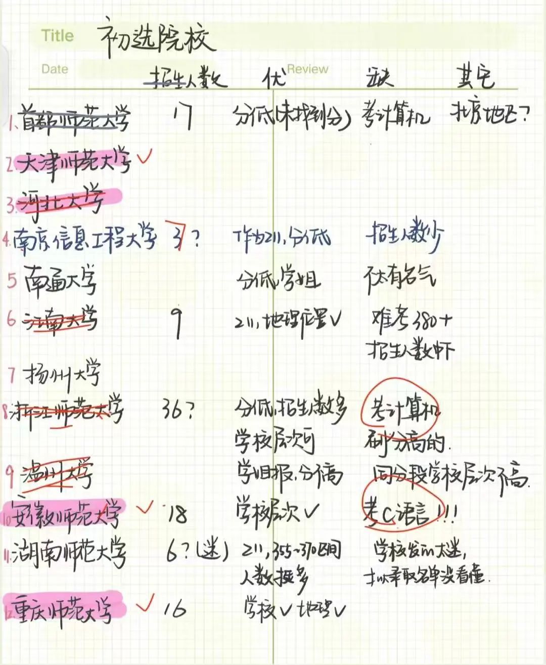 先选择专业再择校。毕竟不出意外,你之后要为之奋斗一生,那么当然是要选择自己感兴趣的专业。确定好专业后就要择校了,这个需要结合自己的备考情况去决定你是“要冲”还是“求稳”。目标院校的选择,光心仪不行,还要考虑自身的实力、考研的难度。参考院校较多的话,建议用表格的形式整理数据,方便比对。