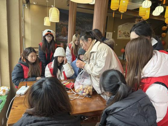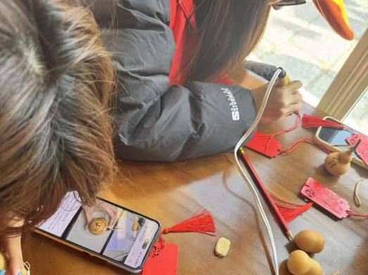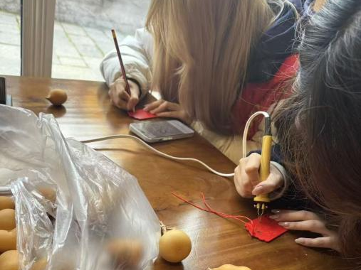 最让同学们着迷的莫过于烙画葫芦体验区。一个个形态各异的葫芦整齐排列,非遗传承人手持烙铁,在葫芦表面轻轻熨烫,深浅不一的烙痕逐渐勾勒出山水、花鸟、人物等精美图案,古朴而雅致。同学们怀着敬畏之心,接过烙铁,在传承人的指导下控制温度、掌握力度。从简单的线条勾勒到复杂的图案创作,每一步都考验着大家的专注力与创造力。当温热的烙铁与光滑的葫芦表面接触,独特的焦香弥漫开来,一幅属于自己的烙画葫芦作品也随之诞生。这不仅是一次技艺的体验,更是一次与传统匠心的对话,让同学们深刻感受到了非遗技艺“慢工出细活”的精髓。
