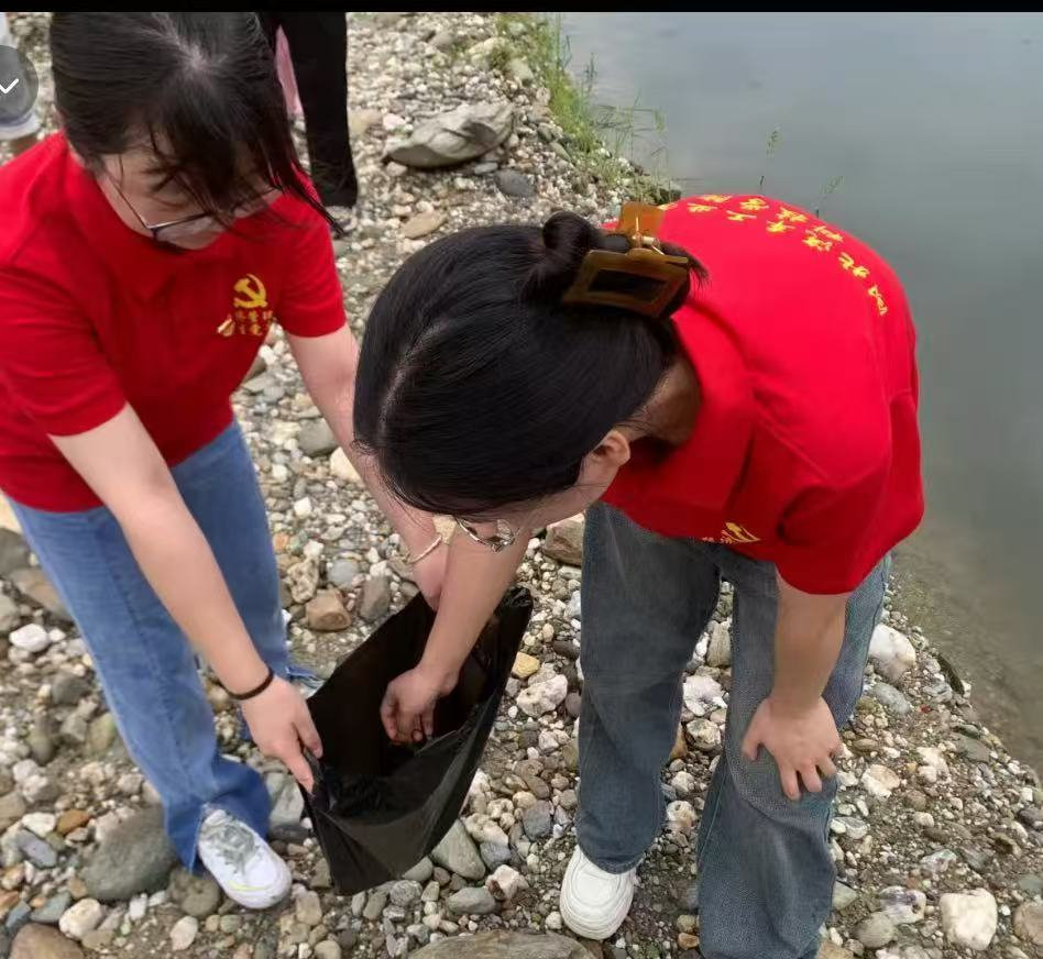 在2025年7月20日至7月27日的实践活动中,团队身着红色志愿服的同学来到河边,投身于生态保护行动。河边布满大小不一的鹅卵石,河水静静流淌,她们专注于捡拾垃圾,一人撑开黑色垃圾袋,另一人弯腰将废弃物收入袋中,动作默契且认真。 她们以实际行动践行环保理念,在河岸步道仔细搜寻,不放过任何一处垃圾。每一次弯腰、伸手,都是对乡村生态环境的呵护,用青春力量为“河畅、水清、岸绿”的乡村水环境添砖加瓦,也让“绿色发展”的种子在实践里扎根生长。
