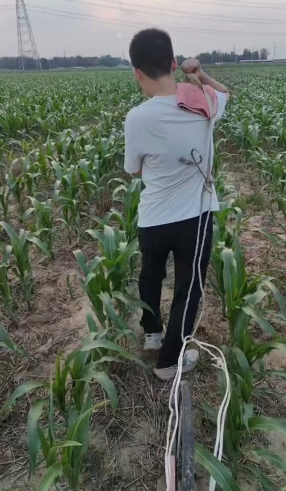 从日出至夕阳西下,为田地洒下希望的肥料 肩头搭着毛巾,身后系着农具绳索,他一步步在玉米行间挪动,化肥一点点从农具中撒进泥土里。每一步都踩在松软却坚实的土地上,像是和这片土地进行一场无声的对话。阳光洒在他的白T恤上,周围玉米叶沙沙作响,他专注于手中与身后的农具操作,把知识里的农业理论,慢慢变成田间实实在在的实践动作,汗水落下,却也让他对“耕耘”二字有了更深刻的体感。 当田间的光影开始变得柔和,他的劳作还在继续。远处的树影朦胧,天空染上浅粉与淡紫,他的身影在这渐暗的光线里,成了乡村劳作图景中一抹坚定的色彩。这一天的实践,于他而言,是课本外的成长,于这片土地而言,是年轻力量注入的新鲜脉动,而每一滴汗水、每一次农具的牵动,都成了这段乡村实践记忆里鲜活的注脚。