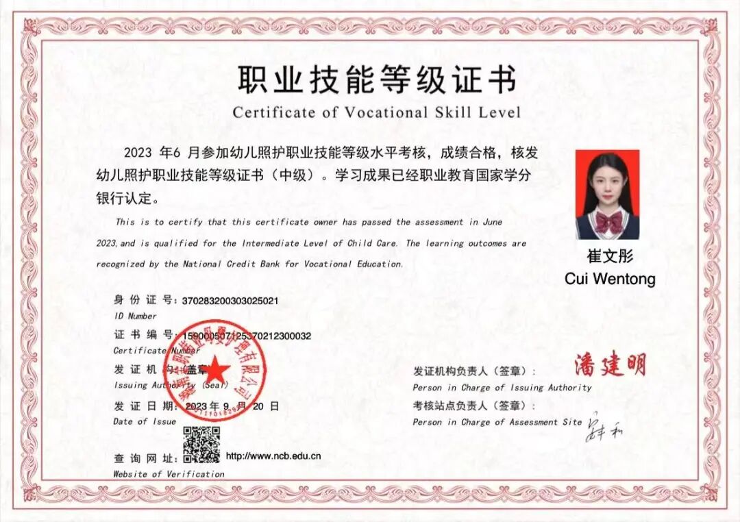 更令人瞩目的是她的"技能通关图鉴":幼儿园教师资格证、幼儿保育中级证书、中国舞蹈考级教师证,让她成为兼具专业素养与艺术特长的"全能型幼师储备军"。山东省优秀毕业生,山东省职业院校技能大赛等荣誉,正是对她学业态度的最佳佐证。