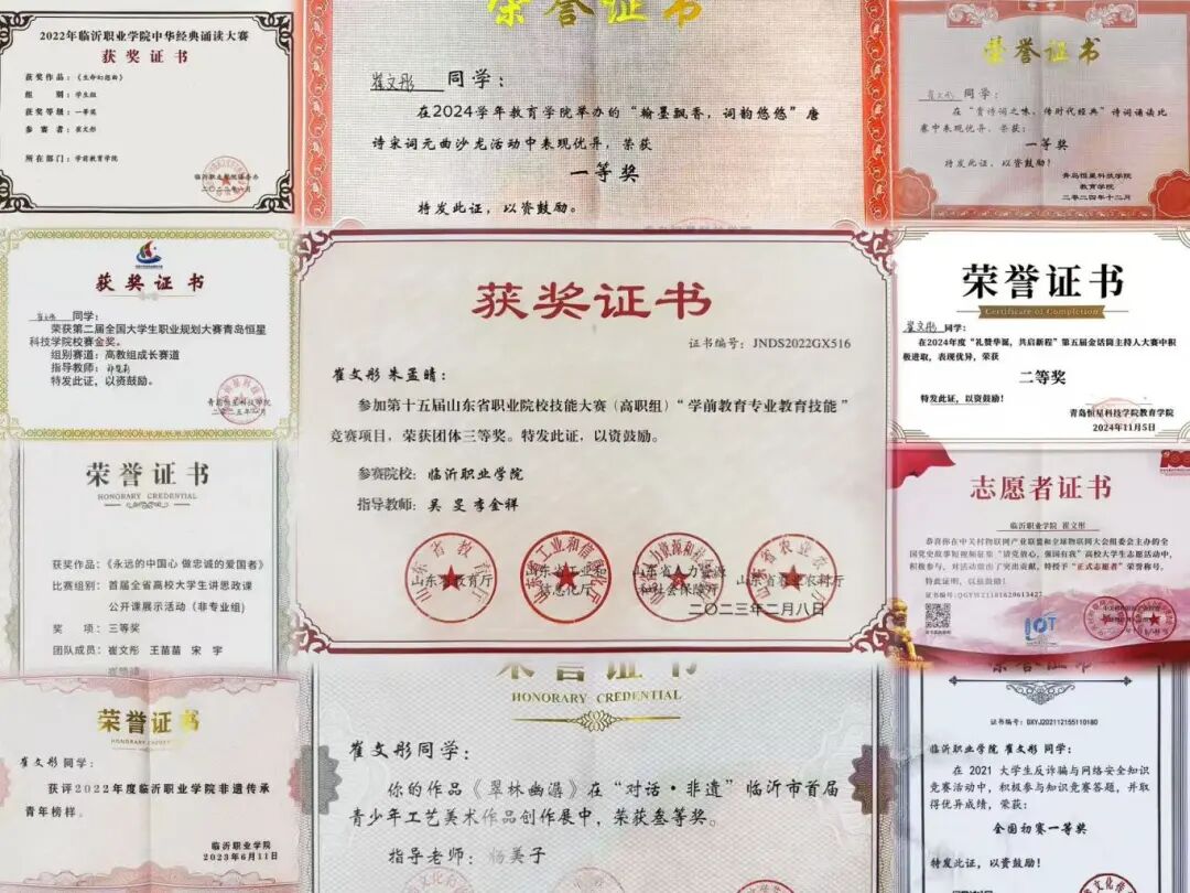 从"一带一路"倡议宣传活动一等奖,到全省高校思政课公开课展示三等奖;从大学生职业规划大赛成长赛道金奖,到山东省第三届“幼有优育、幼耀精彩”短视频征集活动中荣获二等奖,6项国家级、15项省级、23项市级,覆盖思政、专业、技能、创新创业等多个领域,见证了她的全面发展。