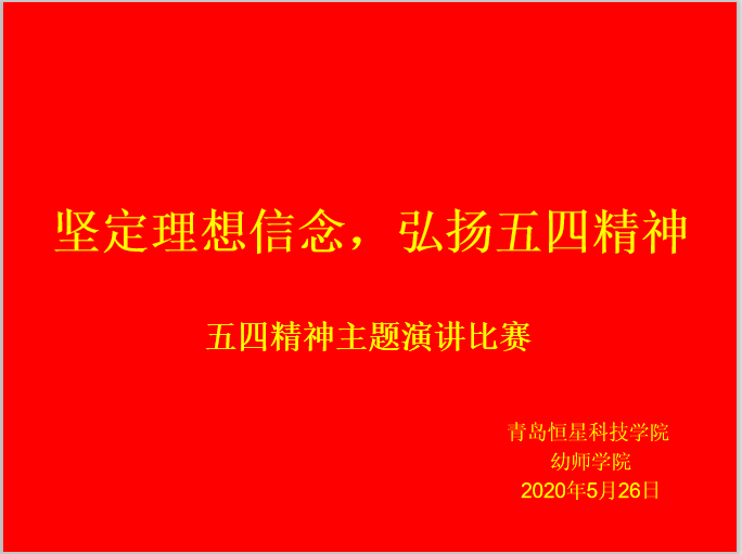 为弘扬爱国主义精神,树立远大理想,磨练坚定意志,培养勇于探索,敢于创新能力,青岛恒星科技学院幼师学院于5月26日举行线上"坚定理想信念,弘扬五四精神"主题演讲活动。本次演讲比赛的参赛选手由19级各班同学投票选举产生,选出代表做为参赛选手参加比赛。